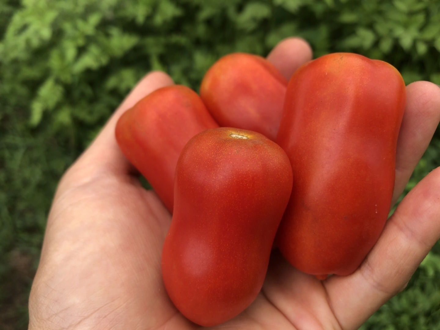 生でも食べられるけど、加熱すると旨味がでるサンマルツァーノトマト。通常のミニトマトに比べて中のゼリー分が少なく、果肉が多いため、火を入れた時に旨味が出てきます。甘いよりも、酸味と旨味のバランスが取れたトマトで、楽しみ方は色々です。