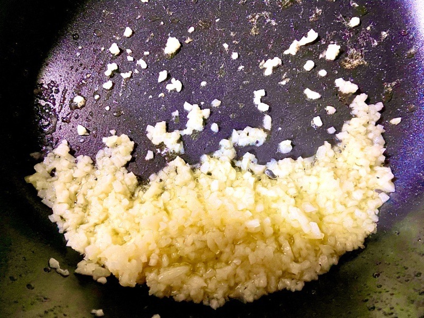 乳化させたオリーブオイルでじっくり炒めたニンニクのみじん切りを、バターをたっぷり塗ったトーストに乗せた最強のガーリックトースト……