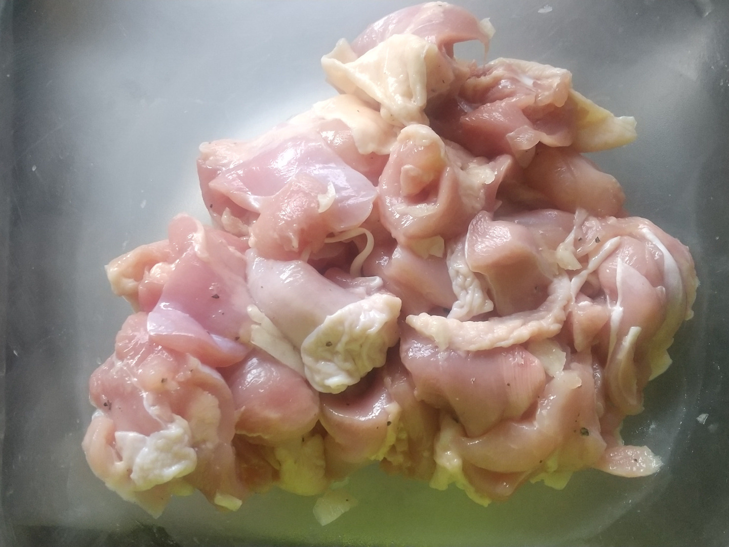 ②鶏肉はひと口大に切ってボウル(耐熱皿を使用するとだとボウルを洗う手間が省けますので耐熱皿で良いかもしれません)に入れ、潰したニンニク、塩、コショウ各少々、オリーブオイル大さじ2を加え30分置いて味をなじませます