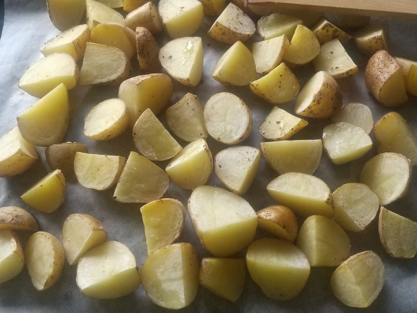 ①ジャガイモは皮つきのまま食べやすい大きさに切り、天板に並べ、塩、コショウ各少々、オリーブオイル大さじ1 をかけ200℃に予熱したオーブンで10分焼く