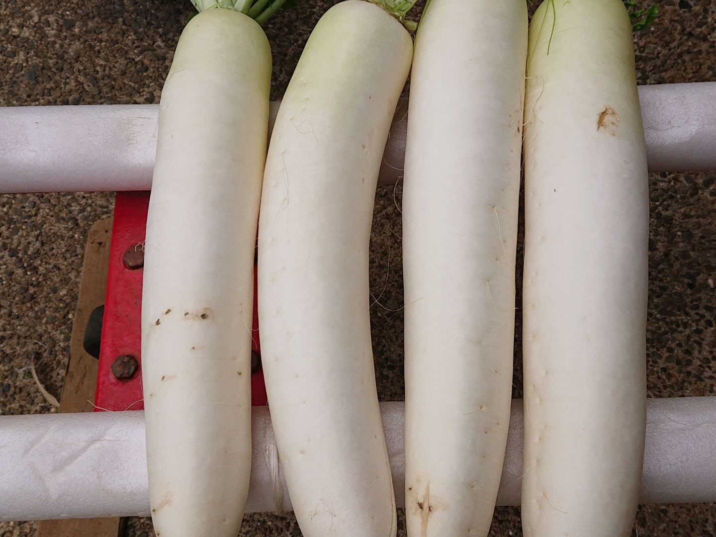 重量過多、曲がり、割れ、皮剥け、病害虫痕等がありの大根です。