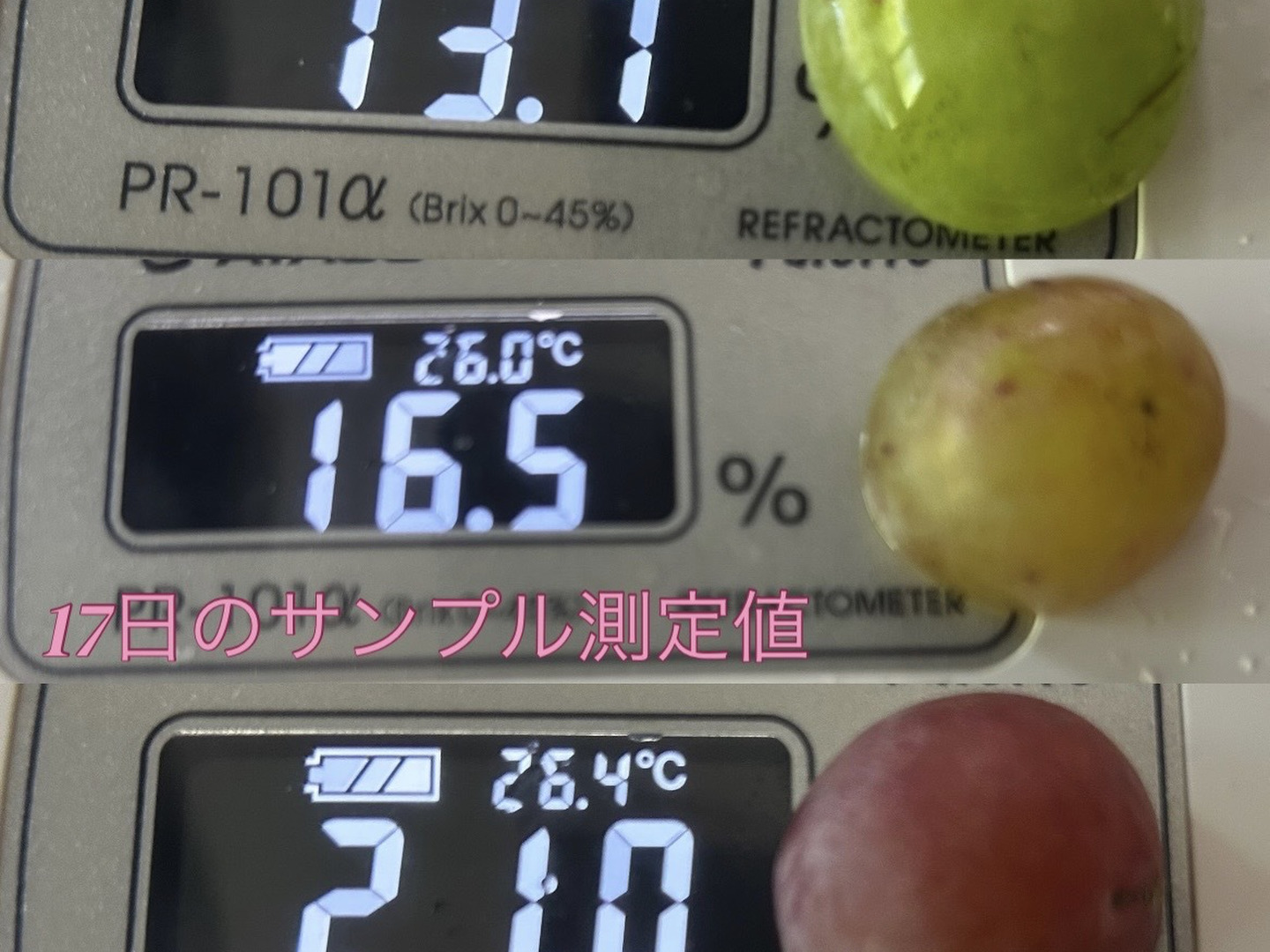 サンプル糖度は 13.7〜18.5° が中心ですが、時々なんと 21°に達する粒が混ざる🦆。