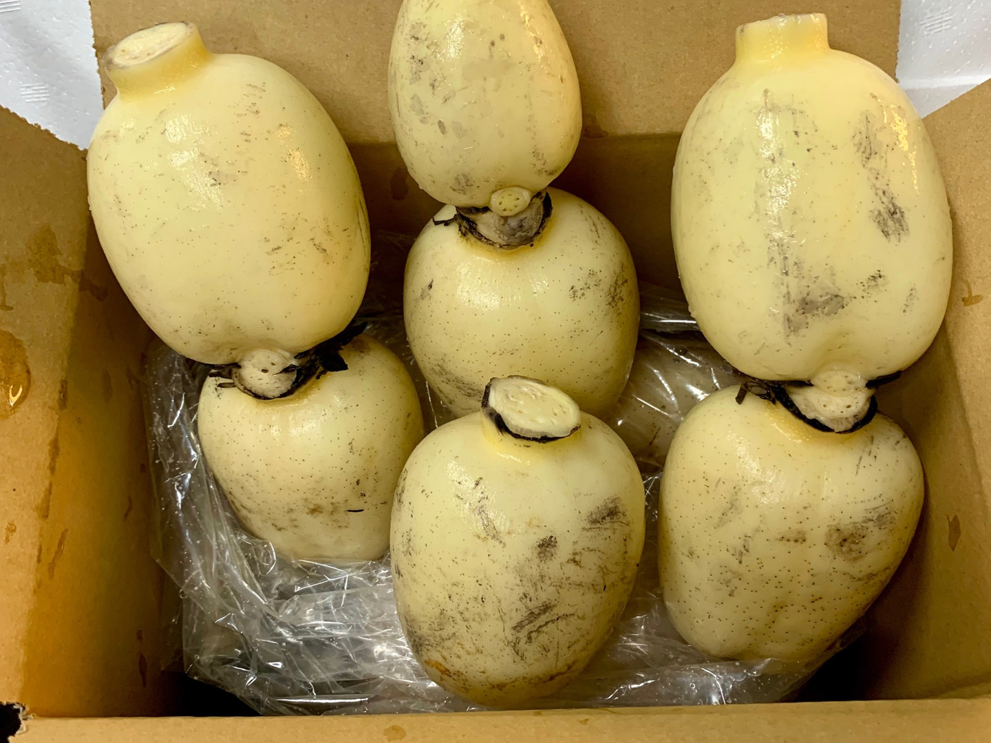 7月から11月・4月から5月は気温が高くクール便にて対応させていただきます。表皮の赤茶色の付着は土中に含まれている鉄分で無害ですのでご安心ください。