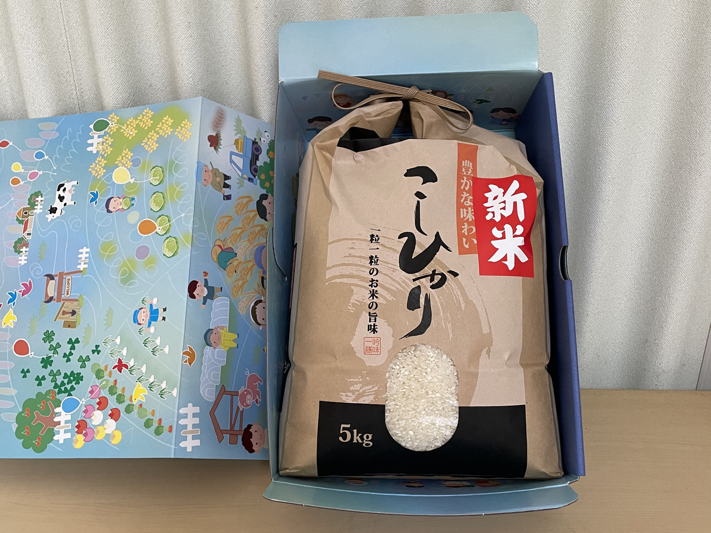 お米の袋には5kgとなっておりますが、箱の重さもあり、実際は約4.5kgとさせていただきます。