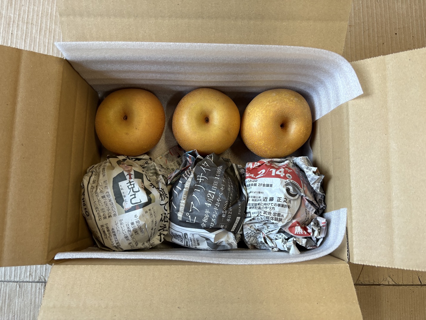 新聞紙で包むなど簡易包装の後、段ボールに詰めて配送します。