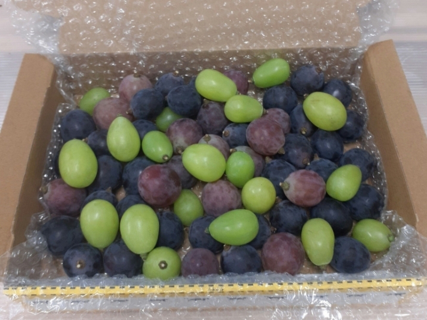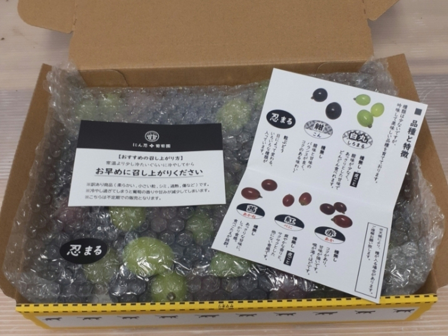 商品について あわせ買い対象 同生産者の別の「あわせ買い対象」商品と一緒にご注文いただくと、送料をまとめてお届けできる場合があります。 生産者からのお知らせ 【配送不可地域について】大変申し訳ございませんが、北海道・沖縄県・離島など三重県からお届け先まで3日以上かかってしまう地域は配送不可となります。予めご了承くださいませ。 もっと見る 内容 二箱 訳あり忍まる 約1800g 発送 ヤマト運輸(食べチョク特別送料) 送料 ¥ クール便(冷蔵) + ¥ 275 数量1点ごとに送料が発生します。 種別 果物 ぶどう その他ぶどう 産地 三重県 慣行栽培 果物 家庭用 その他ブドウ 三重県x果物 三重県xぶどう 三重県xその他ぶどう 商品説明 (訳あり)小さな粒、柔らかい、シミ、過熟、傷、割れ味には問題ありません。配送中に部分的に傷みが悪化する可能性があるため、ご理解お願いします。※訳ありのため、お早めに召し上がりお願い致します。白丸(しろまる)種無し・皮ごと紺(こん)種無し赤(あか)種無し茜(あかね)種無し上記品種の中から3種類以上使用して商品をご用意させて頂きます。※絶対に訳ありの白丸と紺は入っています。 ご覧いただきありがとうございます。にん忍葡萄園では白丸(しろまる)種無し・皮ごと紺(こん)種無し赤(あか)種無し茜(あかね)種無し紅(べに)種無し・皮ごと5種類育てています。※下記に詳しい品種の特徴を記載させて頂いておもります。※写真はあくまでも例です。ご理解頂ける方のご購入をお願いします。※時間指定のみ、ご対応させていただきますのでお問い合わせくださいませ。■注意事項※お早目にお召し上がりください。※到着時に必ず状態の確認をお願いします。※気候や生育状況により稀に種が入っていることがございます。※出荷時に記載の重量以上でご用意しておりますが、配送中の環境により、重量が減少する場合がございます。※天候等の状況で発送日が前後する可能性があります。ご了承ください。※日にち指定は出来かねますのでご注意ください。時間指定のみ承ります。※北海道、九州、沖縄離島など到着に2日以上かかる住所へのお届けはできません。※クール便でのお届けのため宅配ボックス不可となります。※お受け取りいただけなかった場合の返品、再配送はいたしかねますので予めご了承ください。■品種と特徴現在5種類の品種を育成しております。「白丸(しろまる)」 種無し・皮ごと酸味が少なく、あっさりとした甘味でどんどん食べられます。「紺(こん)」 種無し酸味と甘味のバランスが良く、コクのある味わいです。「赤(あか)」 種無しコクがあり、甘味が強いです。食後には喉が渇いてしまうほどです。「茜(あかね)」 種無しあっさりとした甘味で食感が良く、食べごたえがあります。「紅(べに)」 種無し・皮ごと爽やかな香りと甘味で、サクサクとした他にない食感です。種類は少ないですが、吟味して美味しい品種を育てております。 もっと見る この商品のことをお友達にもシェアしませんか ポスト シェア
