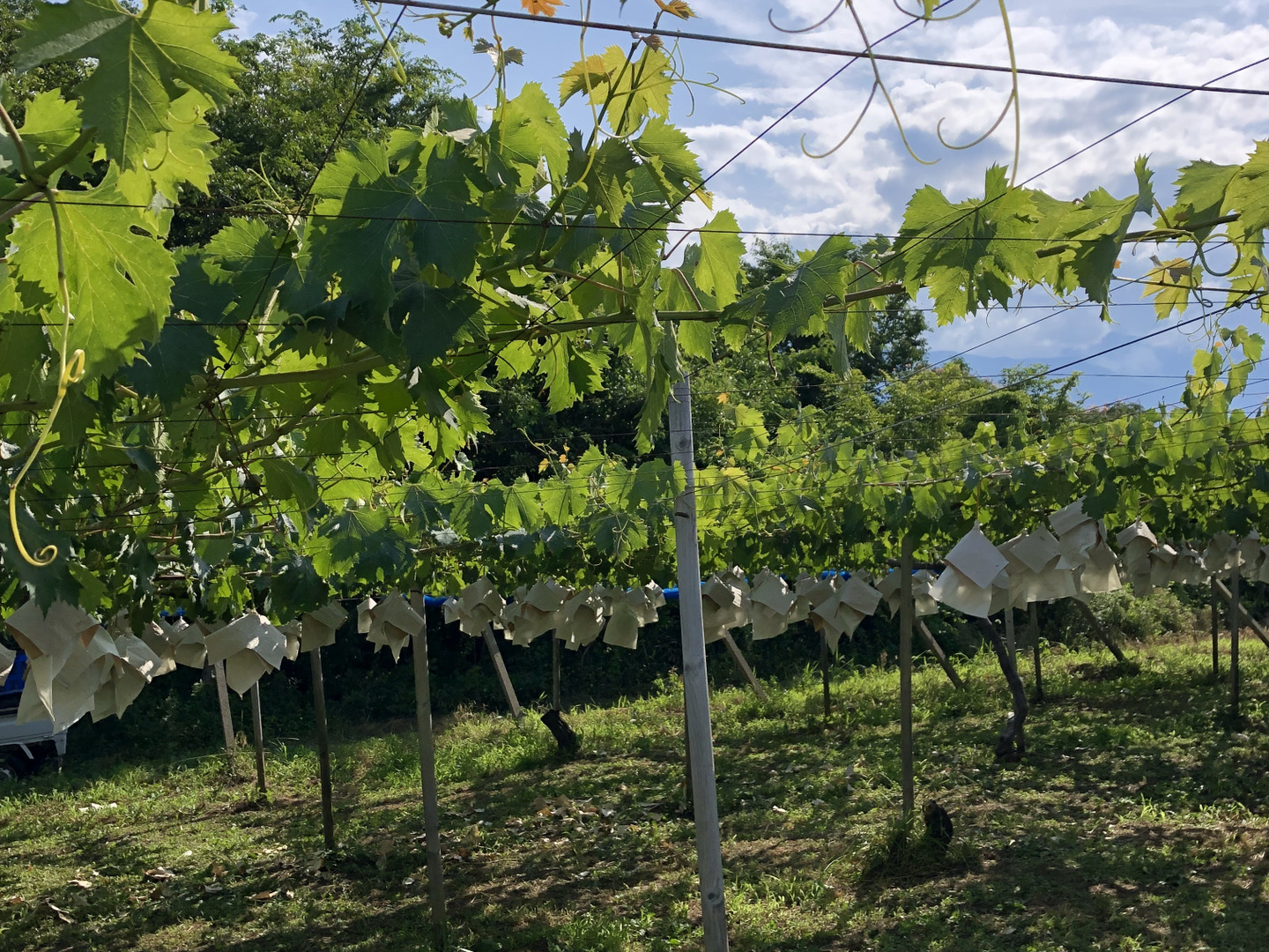 シャインマスカット(緑)、巨峰、ピオーネ(黒)、ゴルビー(赤)です。
