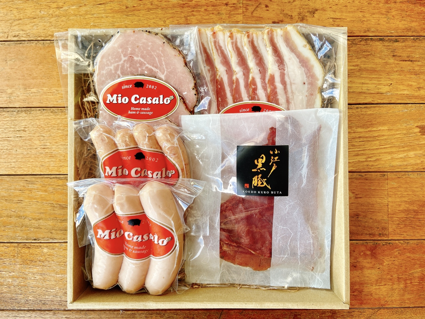 | 内容 | ベーコンスライス(80g)、パストラミハム(60g)、ポークジャーキー(30g)、ソーセージ4本入り(100g×2パック) | ||||||