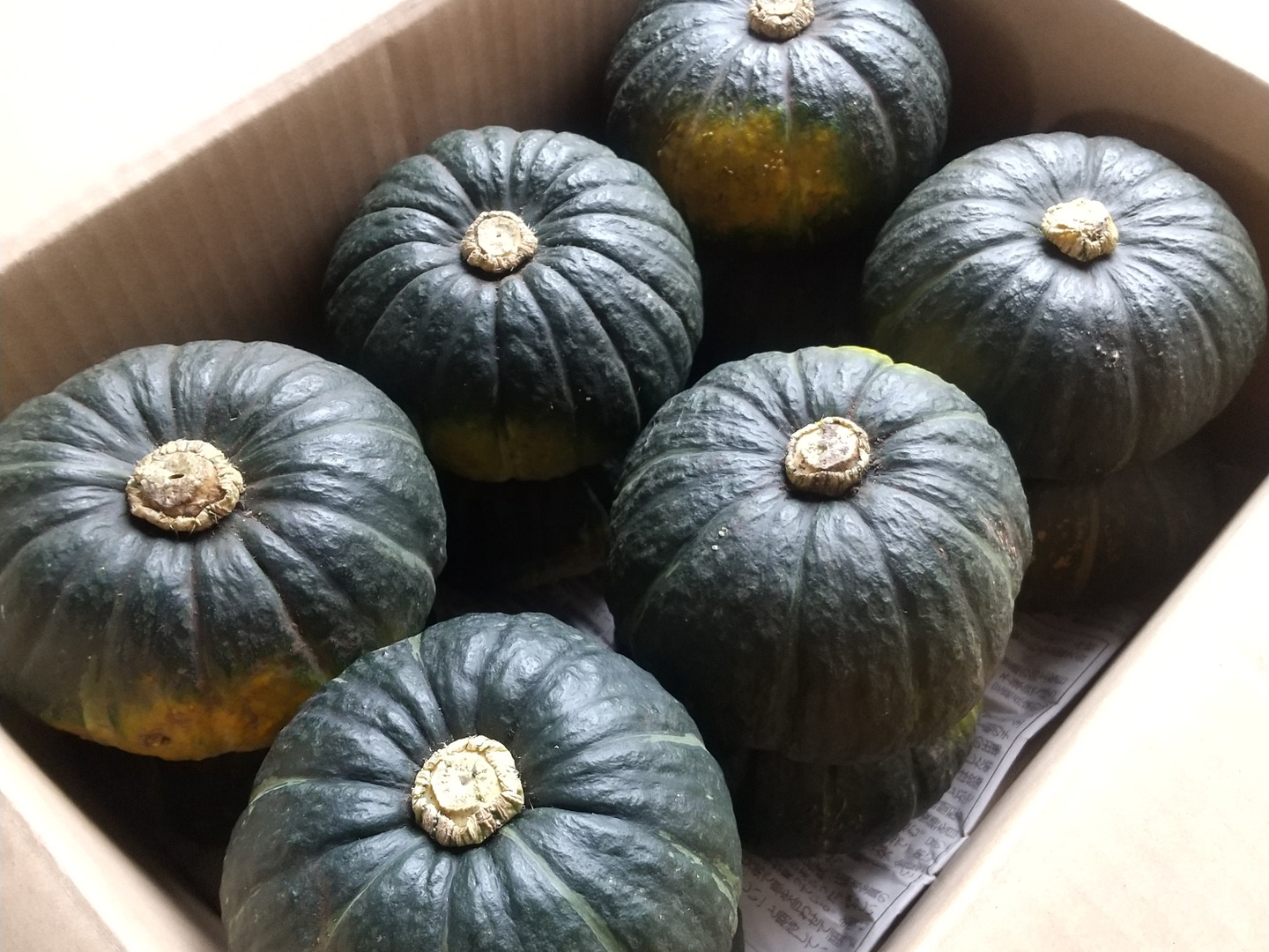 手のひらサイズの坊っちゃんかぼちゃが12〜13個入ります。400〜500g サイズ混合で合計5kgほどです。