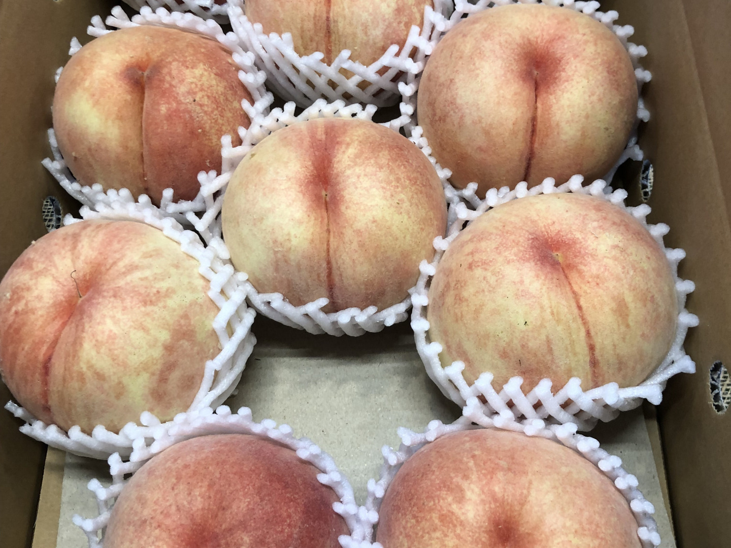今シーズン最終、色の薄い桃ですので糖度の低い桃も入ります。実はしっかりしているので生食でお手軽にたくさんの桃を食べたい方におススメです。キズや痛みが無いので加工用にもロスなく使えます。