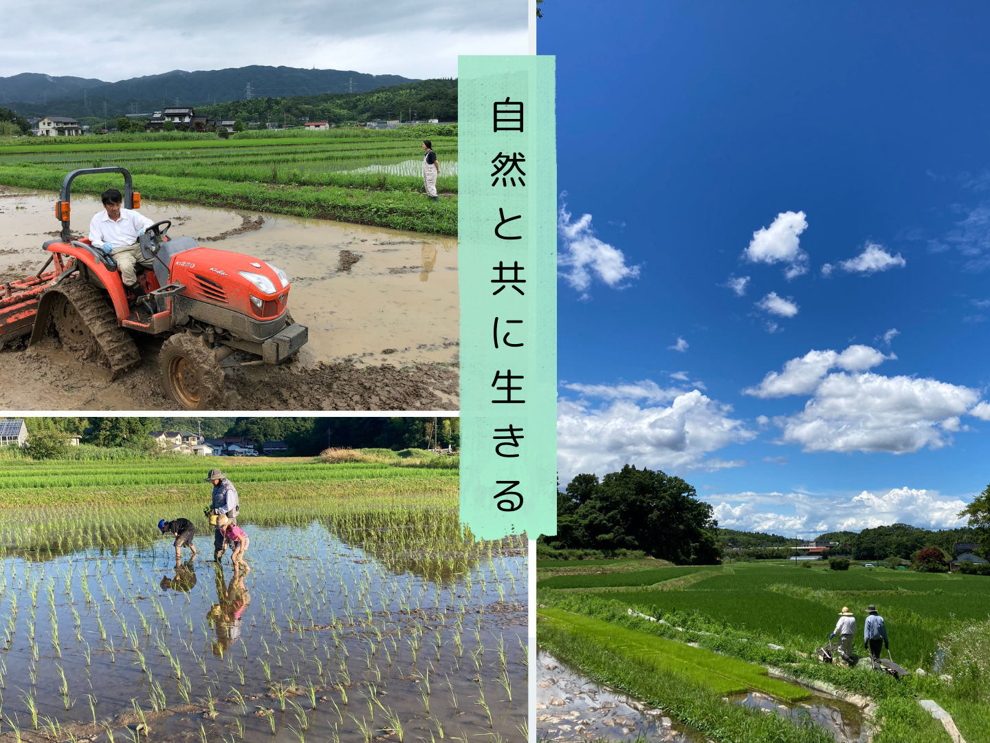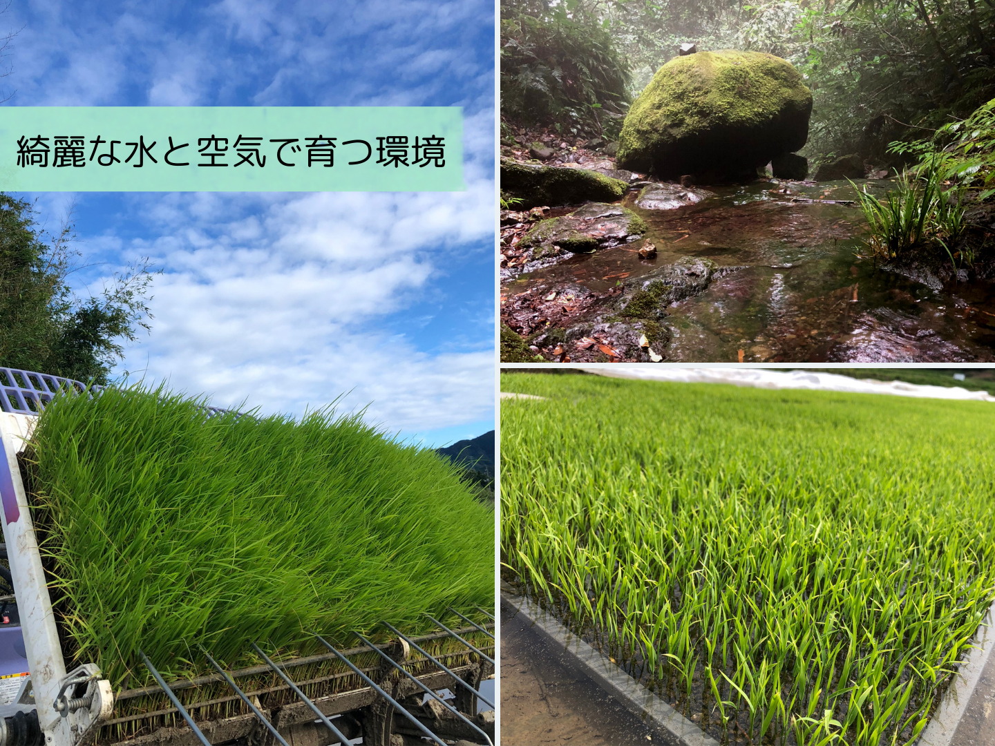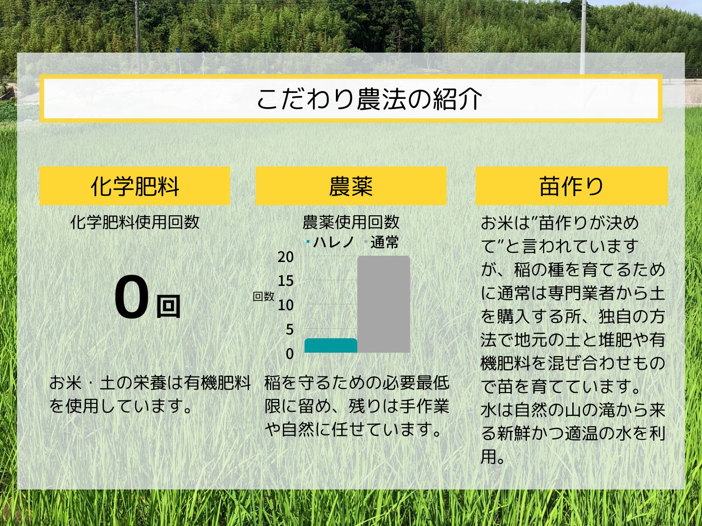 ①安心・安全を第一に栽培過程の中で農薬は殺虫剤、殺菌剤不使用、基本除草剤一度のみ*と慣行(通常)使用量の8割減の必要最低限で育て、残りは手作業と自然の力で稲を守っています。(*田んぼの状態によって稲を守るために2度使用することがあります)