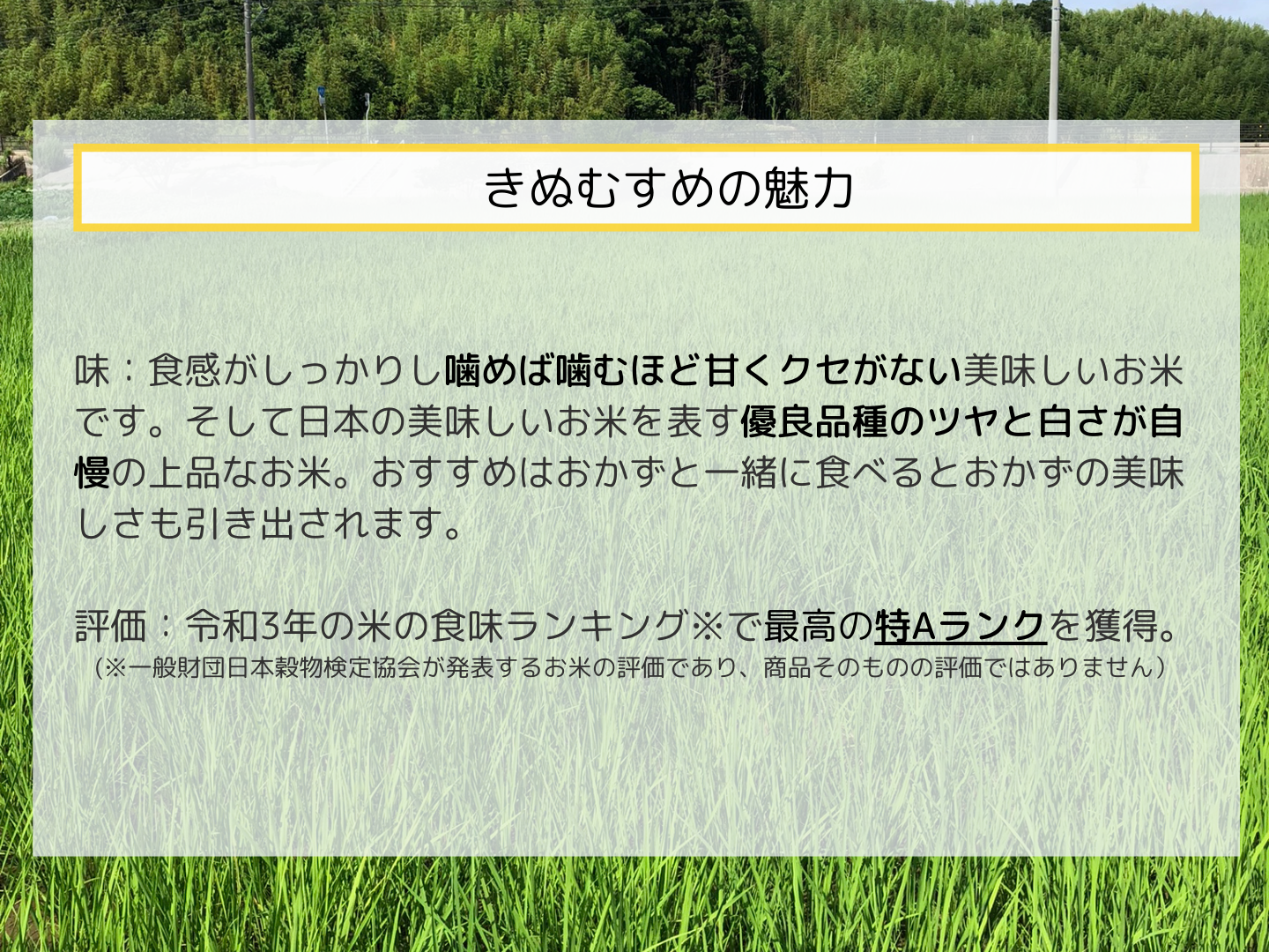 きぬむすめは安定した日本の美味しいお米を表す優良品種のツヤと白さが自慢です。食感がしっかりし噛めば噛むほど甘くなる美味しいお米です。あっさり系でおかずとの相性は抜群です!