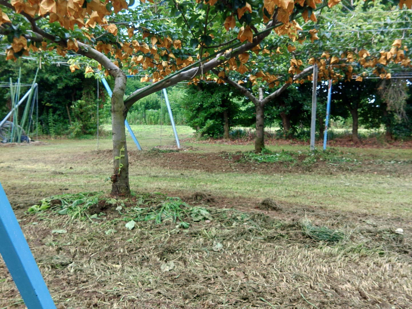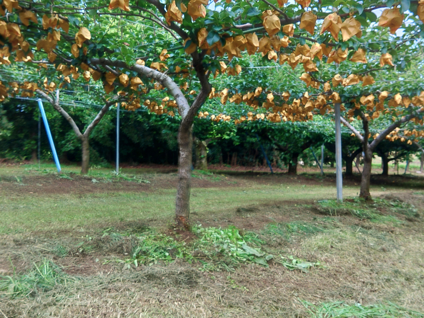 一つ一つの梨に日光がよく当たるように枝を配置し、大きな梨に育つように着果制限して育てます。