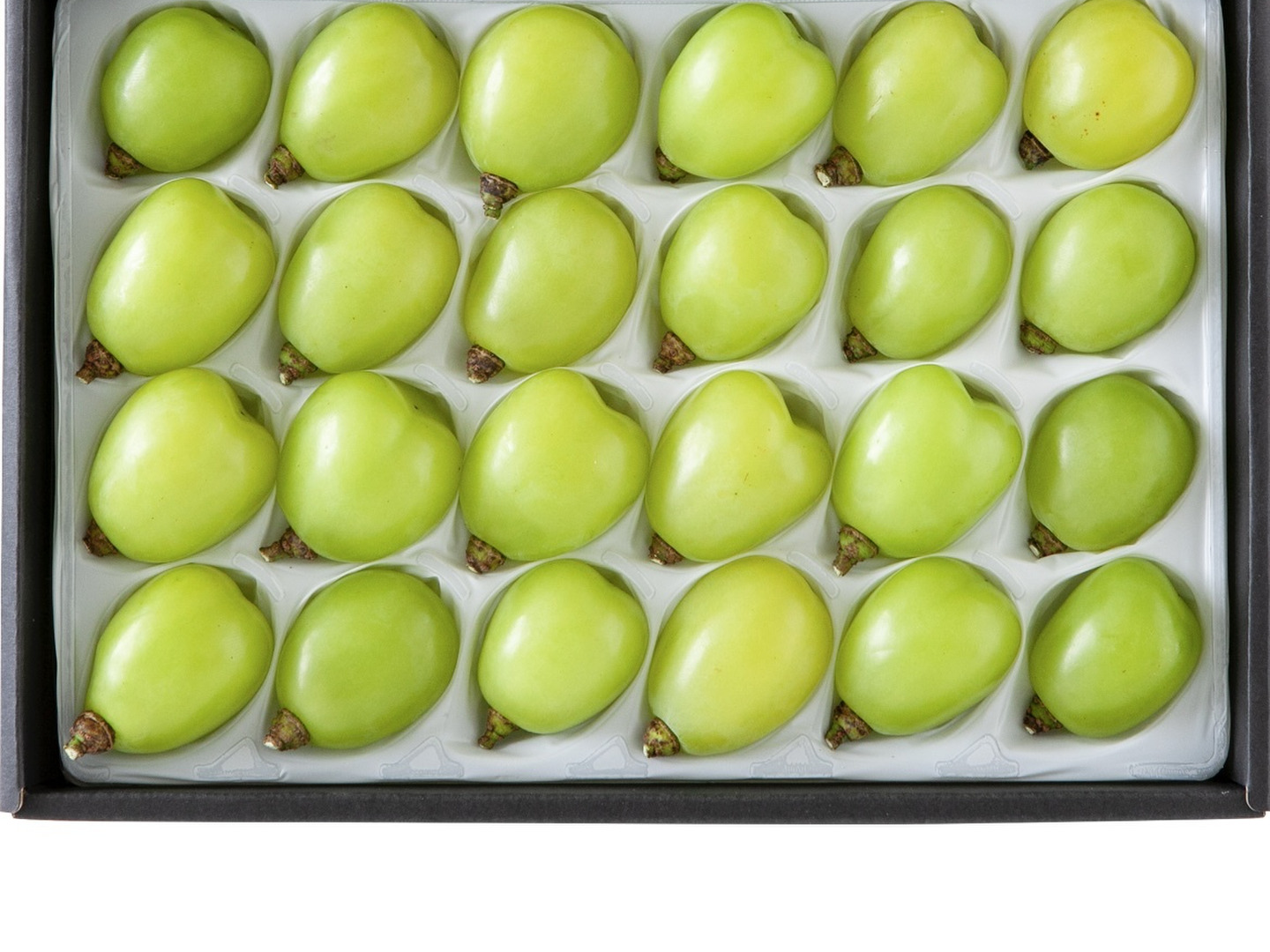 「秀品」のブドウの房から選び抜かれた一粒を箱入りし、その際に糖度計で糖度を測定し