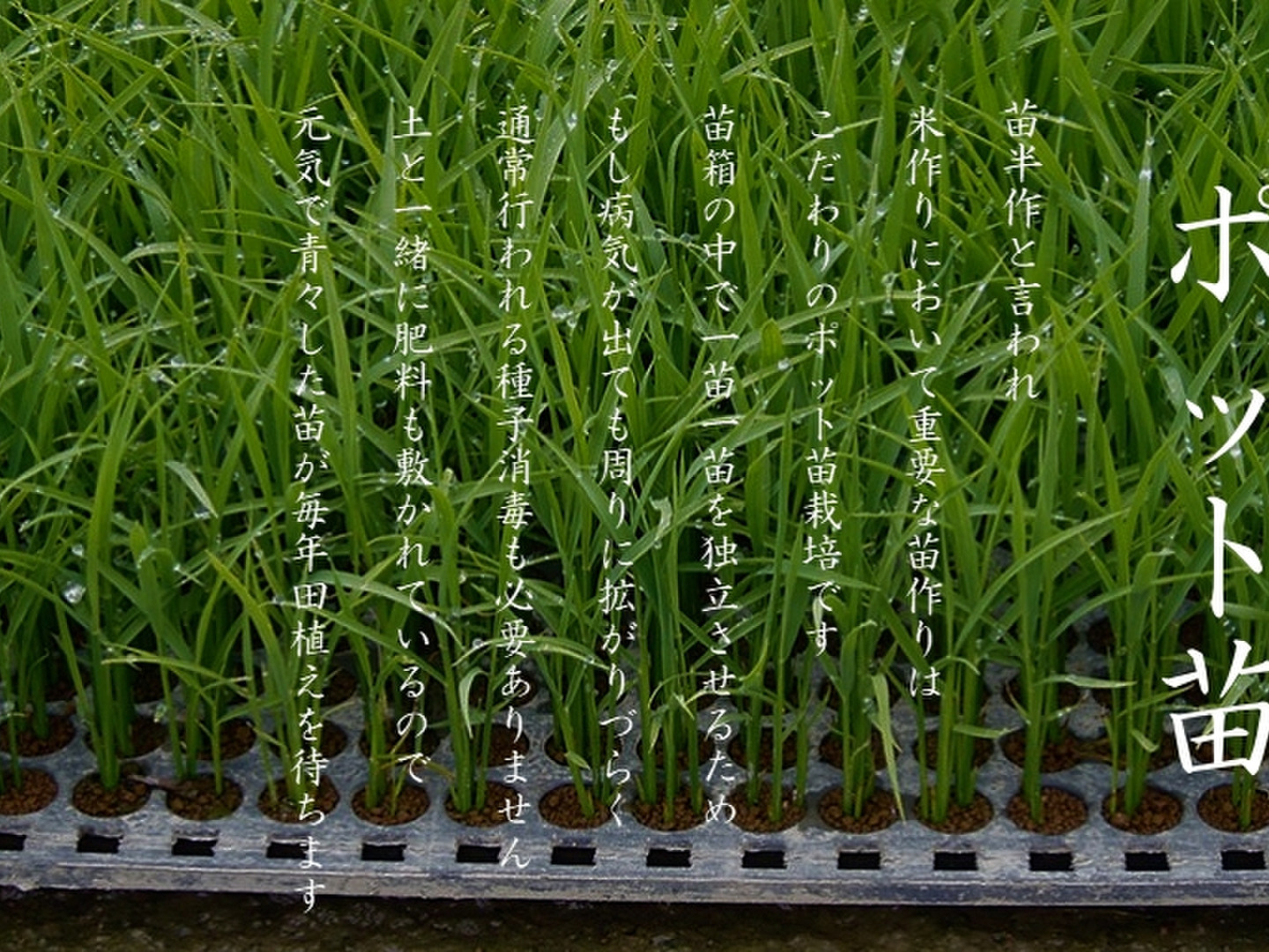 苗半作と言われ、米作りにおいて重要な苗作りはこだわりのポット苗栽培です。
