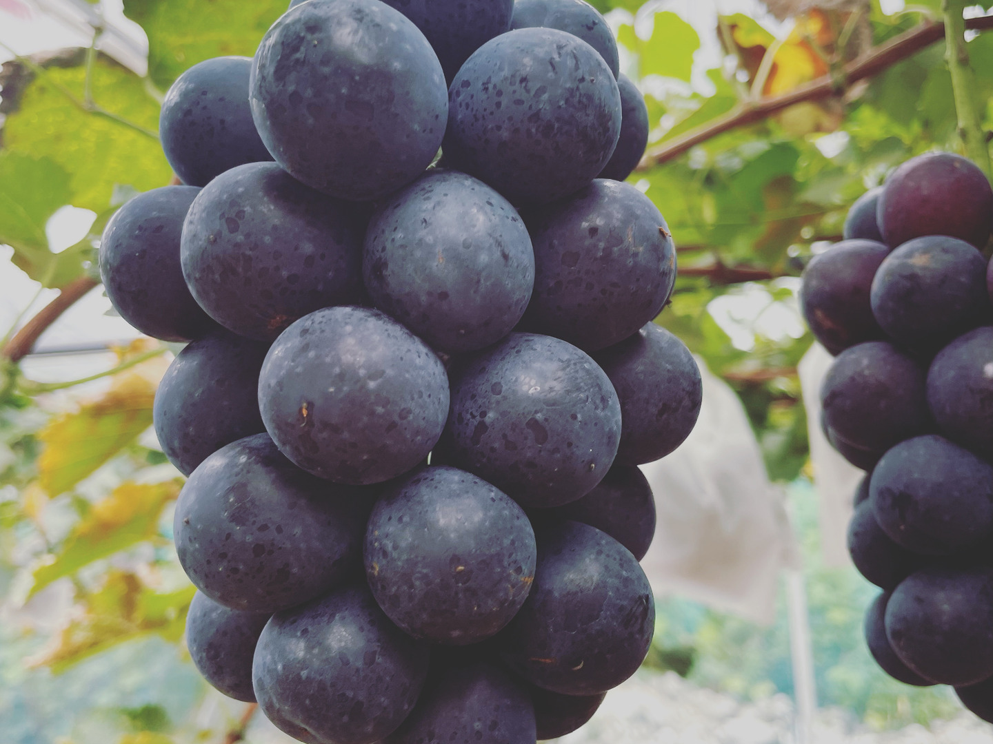皮にはポリフェノールが多く含まれ1房で赤ワイン1本分程度のレスベラトロール(ポリフェノールの一種)が摂取できると言われています。そのため皮には独特の渋みがあり甘さとのバランスが非常に良いぶどうです。