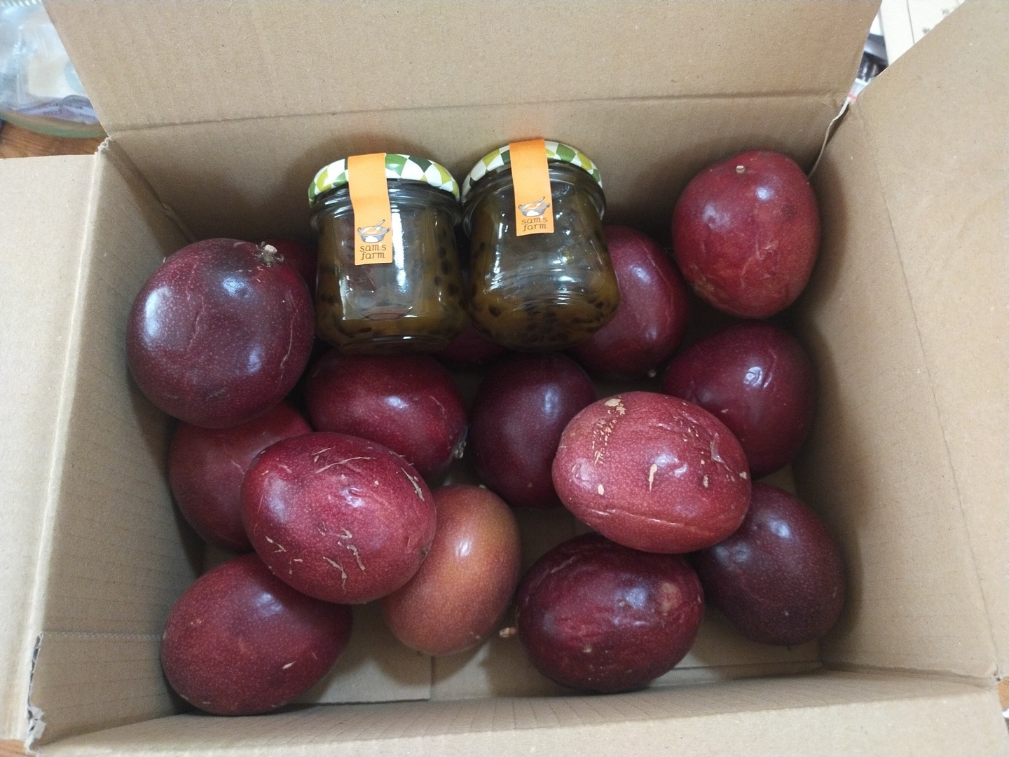 パッションフルーツ くだもの時計草。愛媛県産。1個60g以上、約14~18個で1kgです。色ムラ・傷・しわ等ありの家庭用です。自然落下した物です。