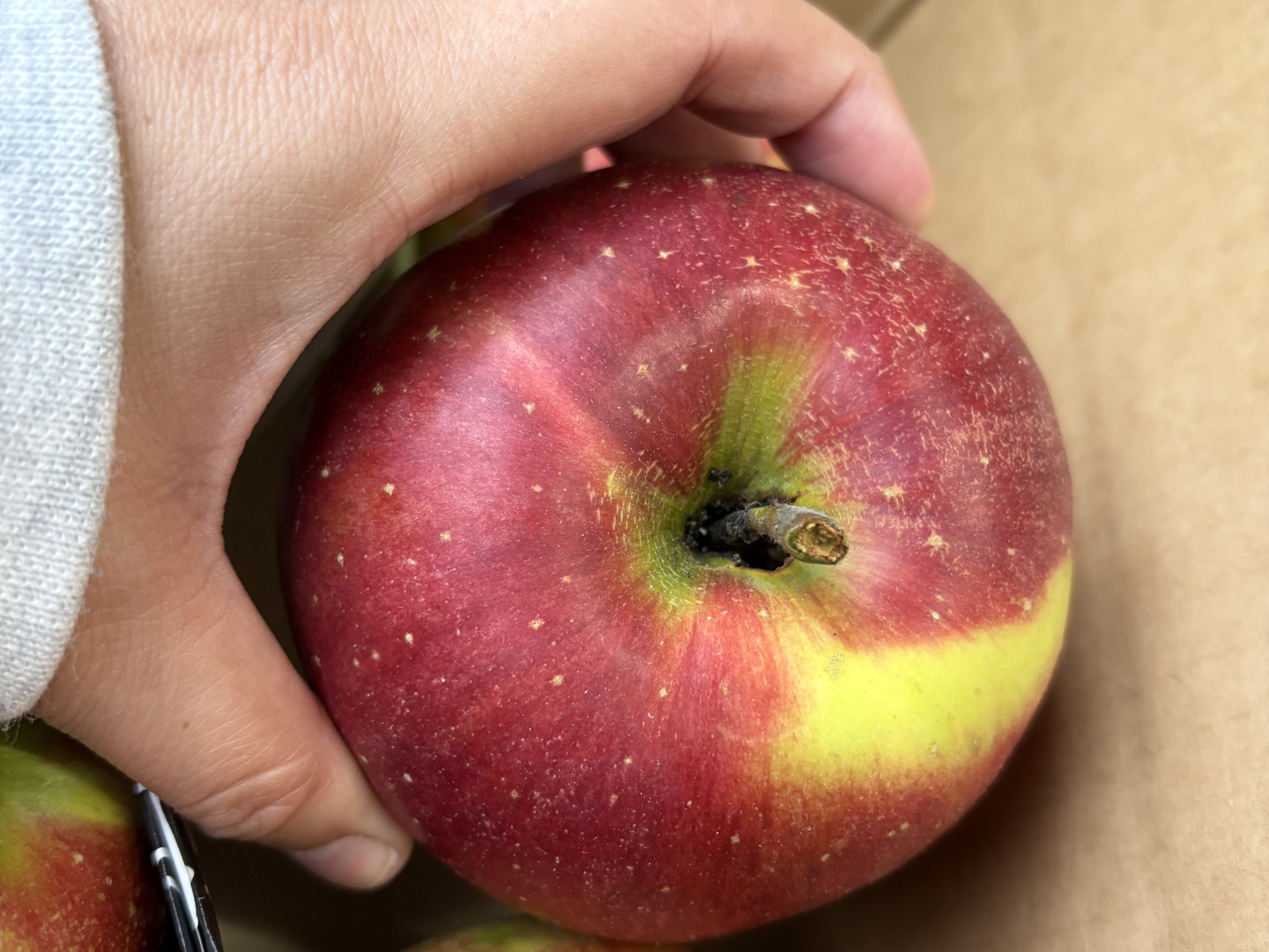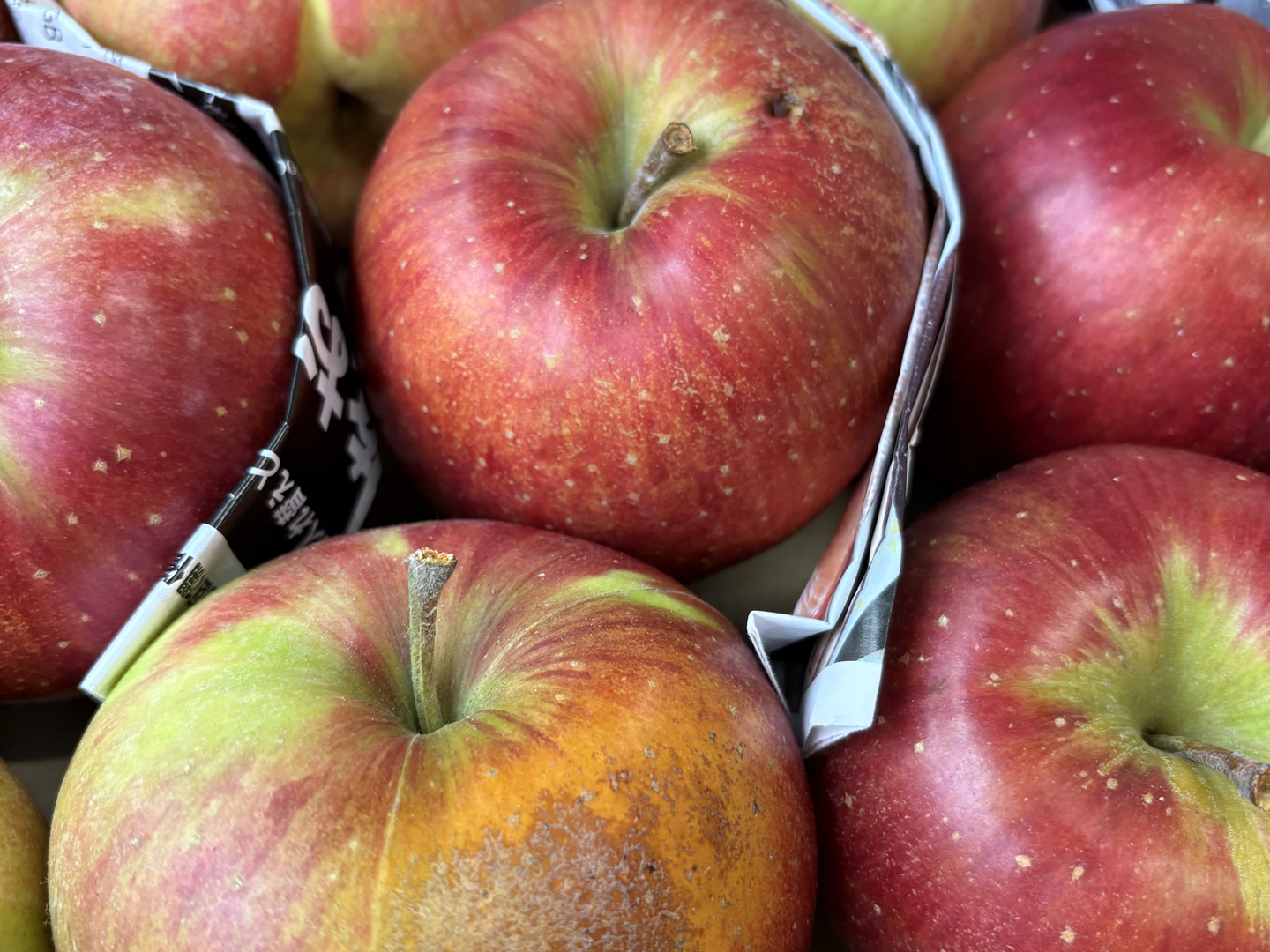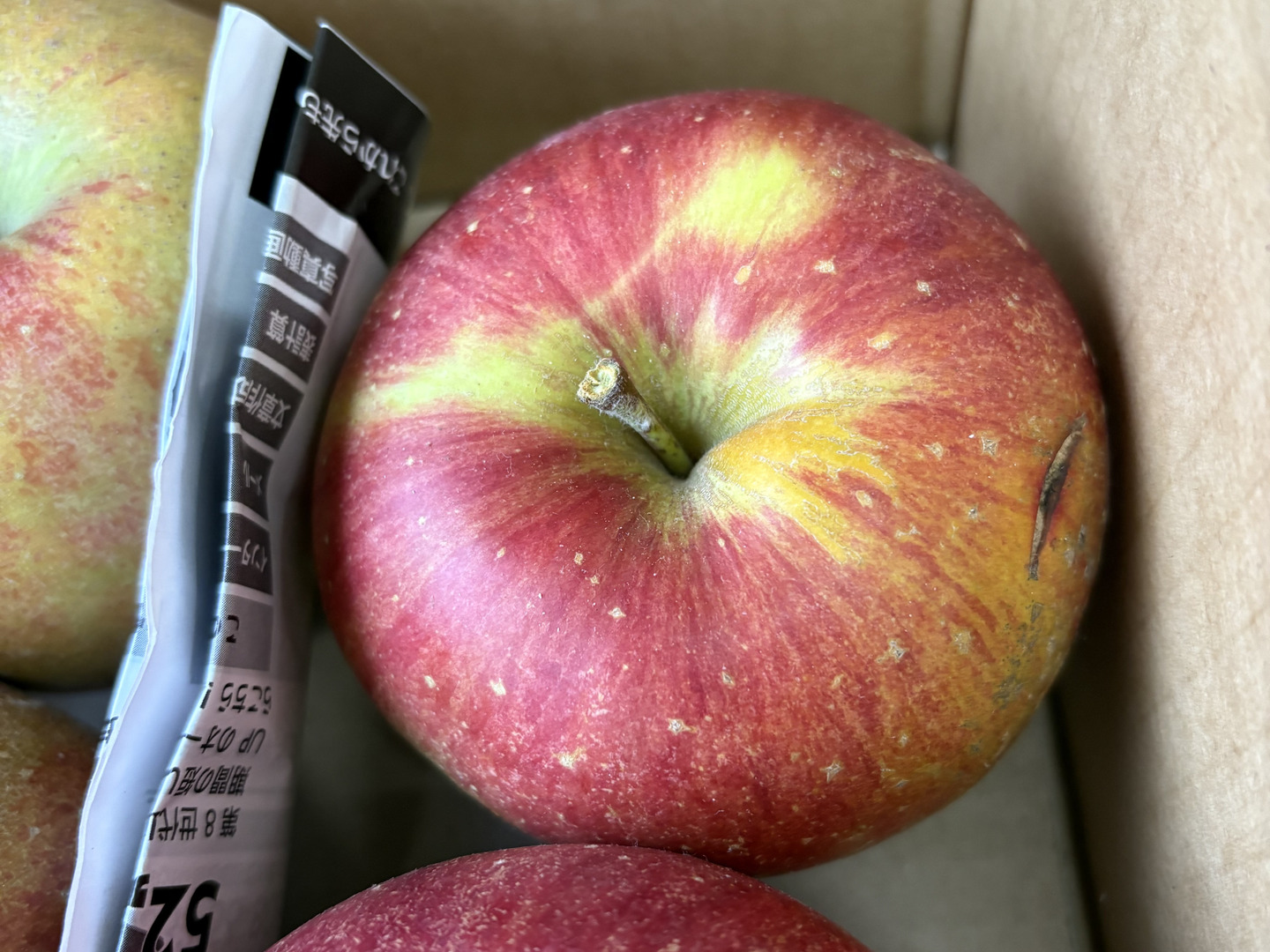 ※ツル割れとは:りんごの成長に果皮が追い付かずにツルの根が割れてしまします。完熟のあかしともいえます。ツル割れ、傷部分は取り除きお召し上がりください。