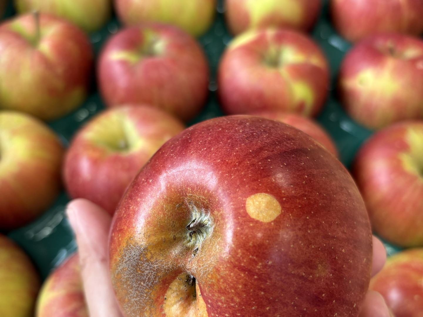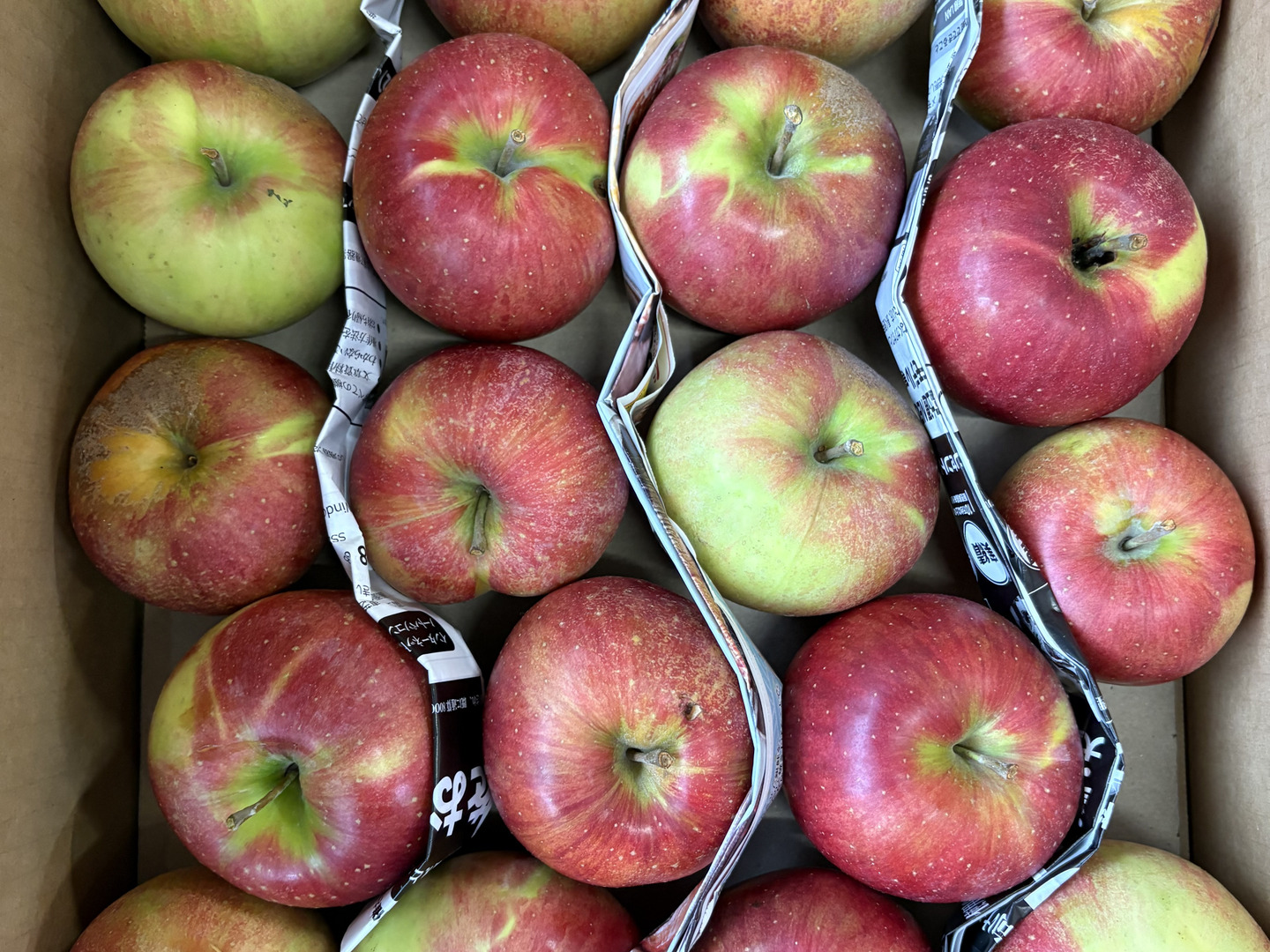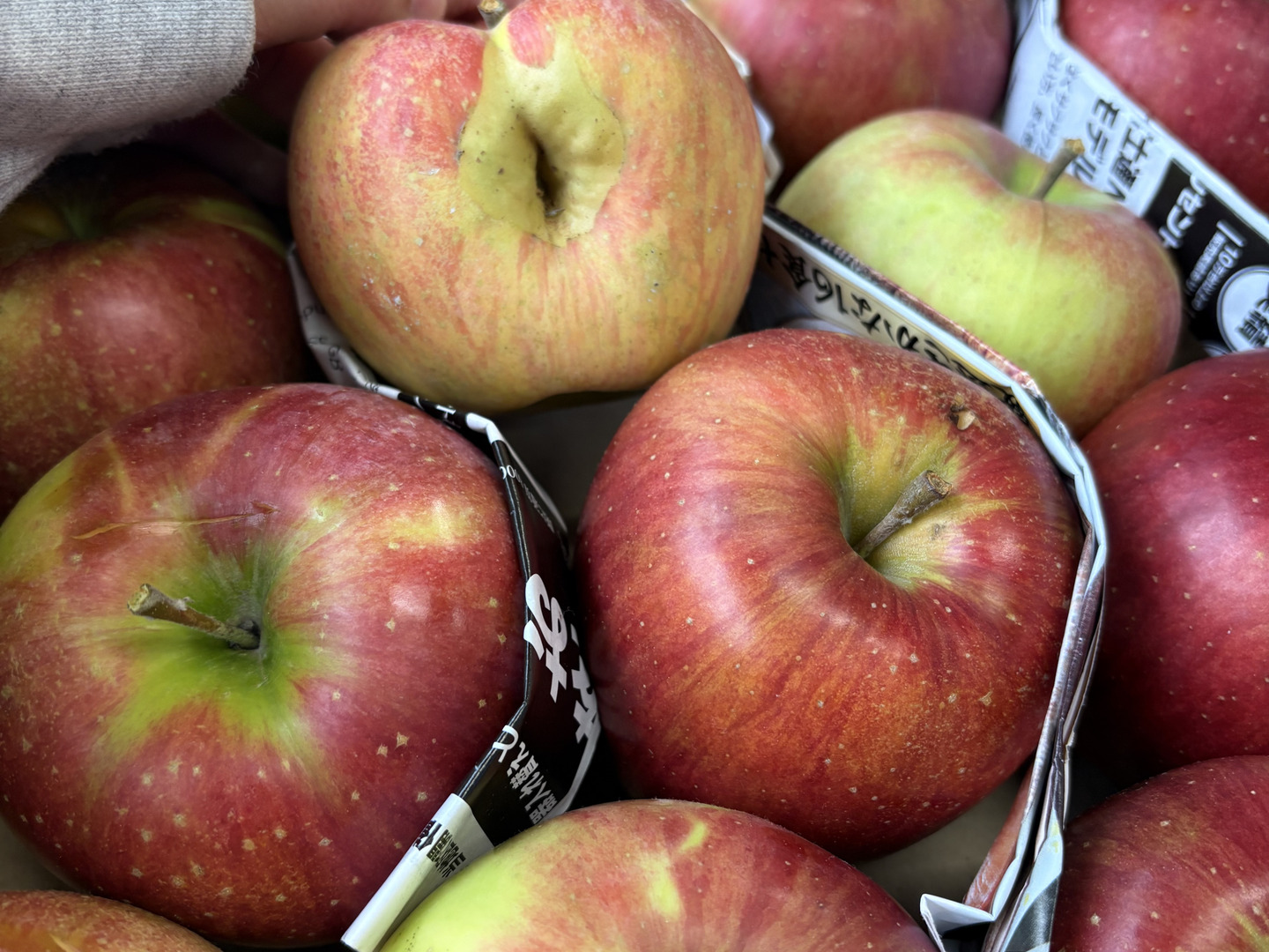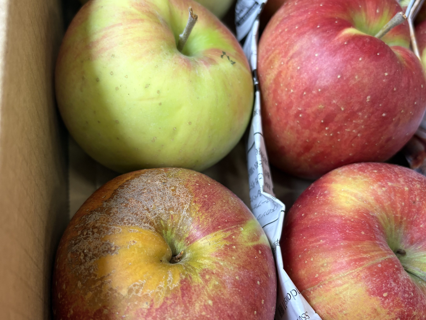 ※ツル割れとは:りんごの成長に果皮が追い付かずにツルの根が割れてしまします。完熟のあかしともいえます。ツル割れ、傷部分は取り除きお召し上がりください。