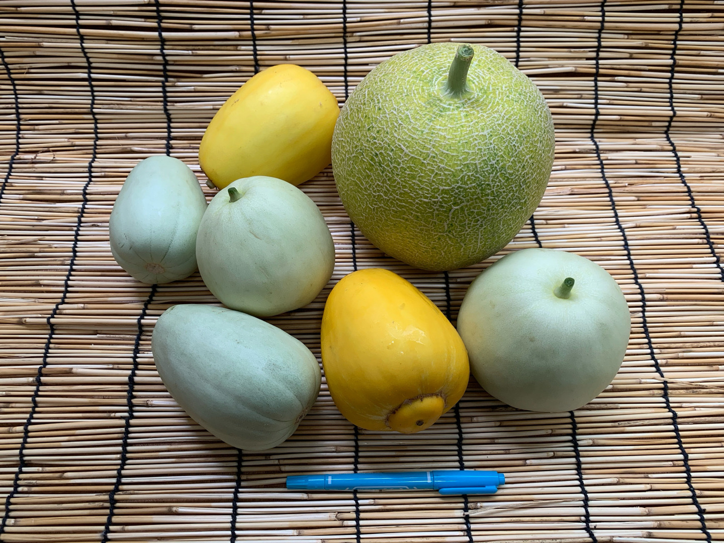 参考重量として、2・3枚めの写真の各種メロンで4kg強となります。