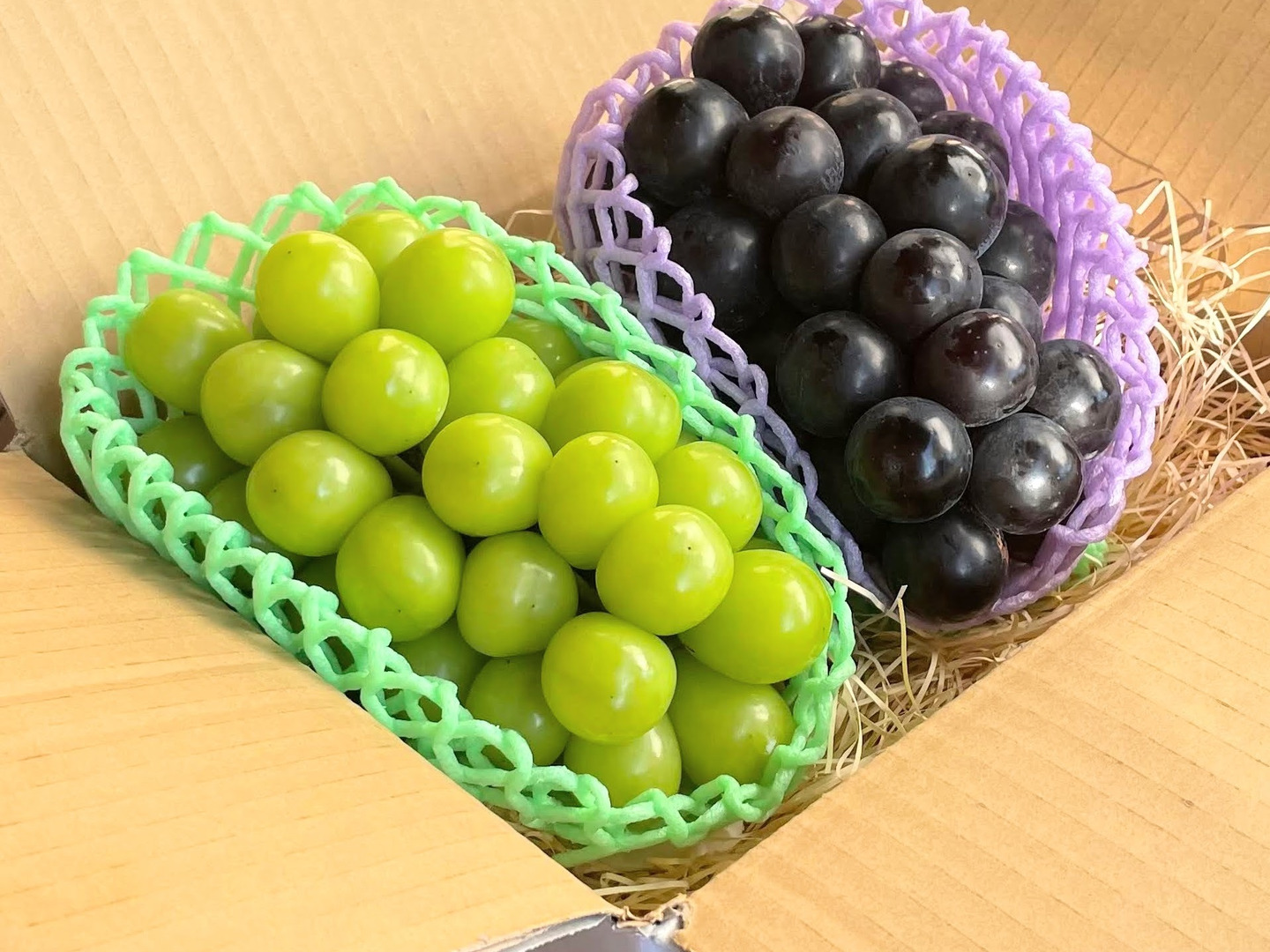 シャインマスカットは、華やかで爽やかなマスカット香と芳醇な甘さが魅力の緑色ぶどうです。ナガノパープルは、甘さが爽やかでコクがある黒ぶどうです。どちらも皮ごと食べられます。