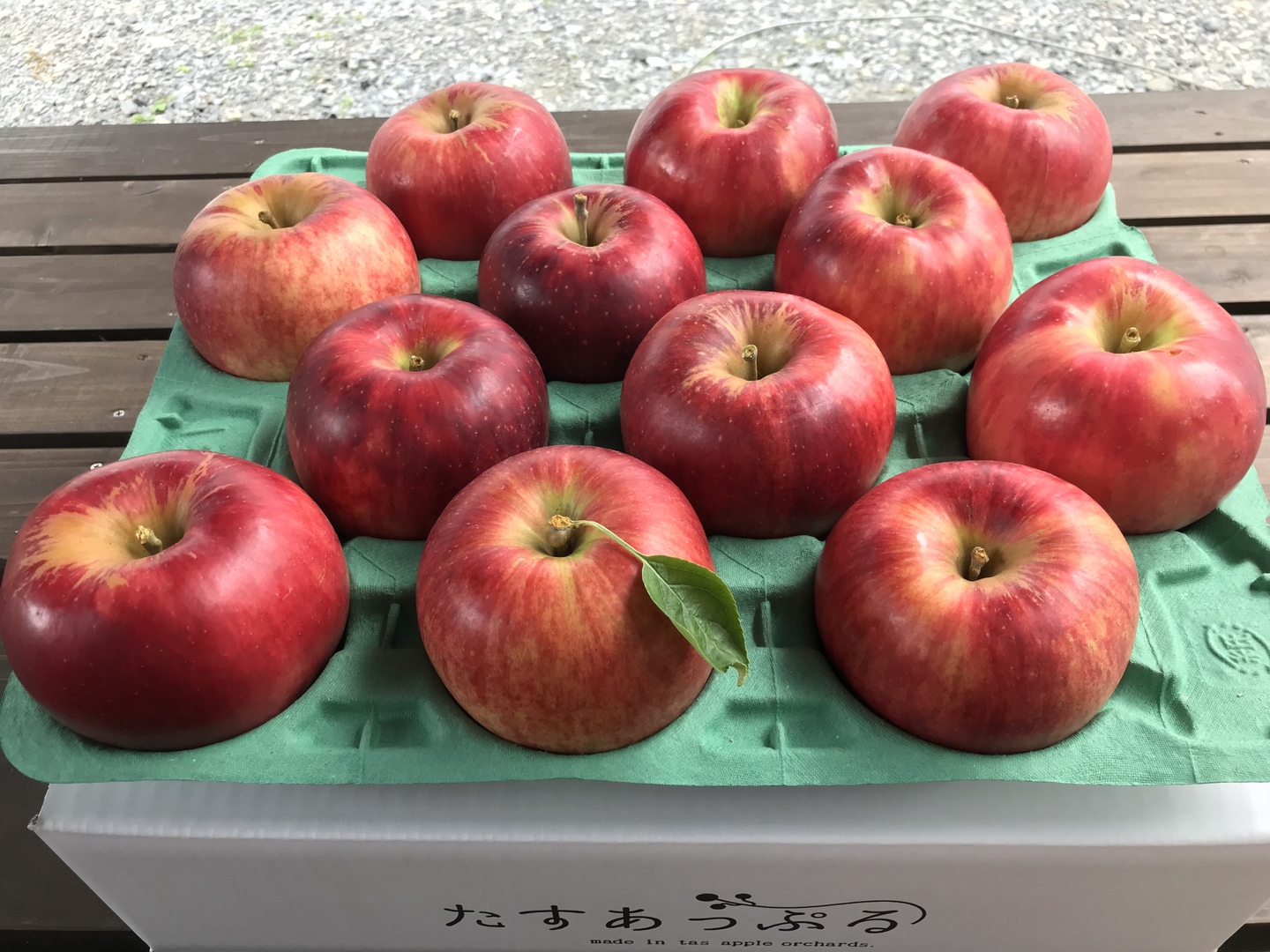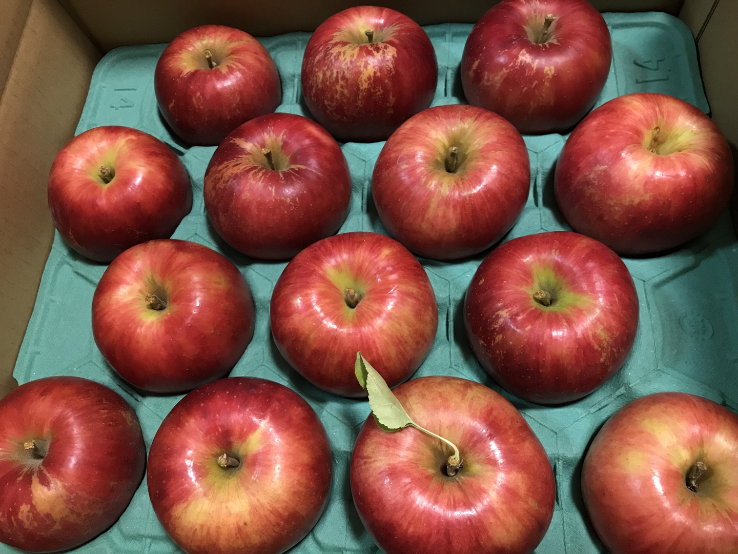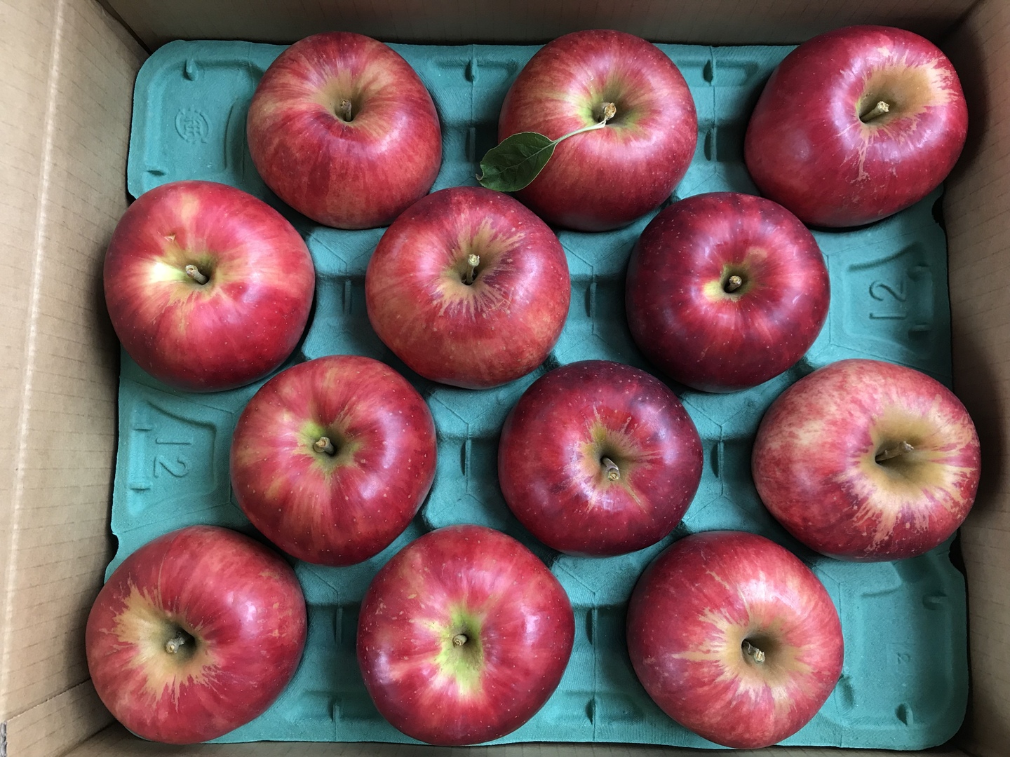 葉とらず栽培のため全面が綺麗な赤色のりんごではありませんが、すべてしっかりと完熟させてから収穫したものです。葉とらずりんごの味の濃さを実感していただければと思います。