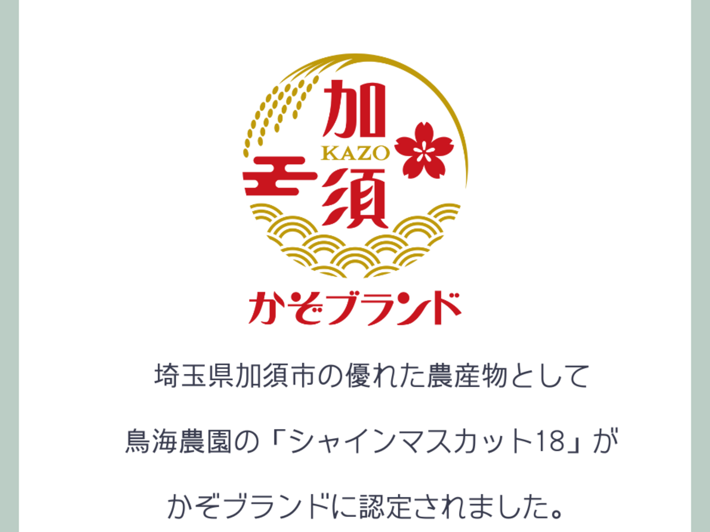 2023年に埼玉県加須市の優れた農産物として、鳥海農園のシャインマスカットをかぞブランドに認定していただきました。