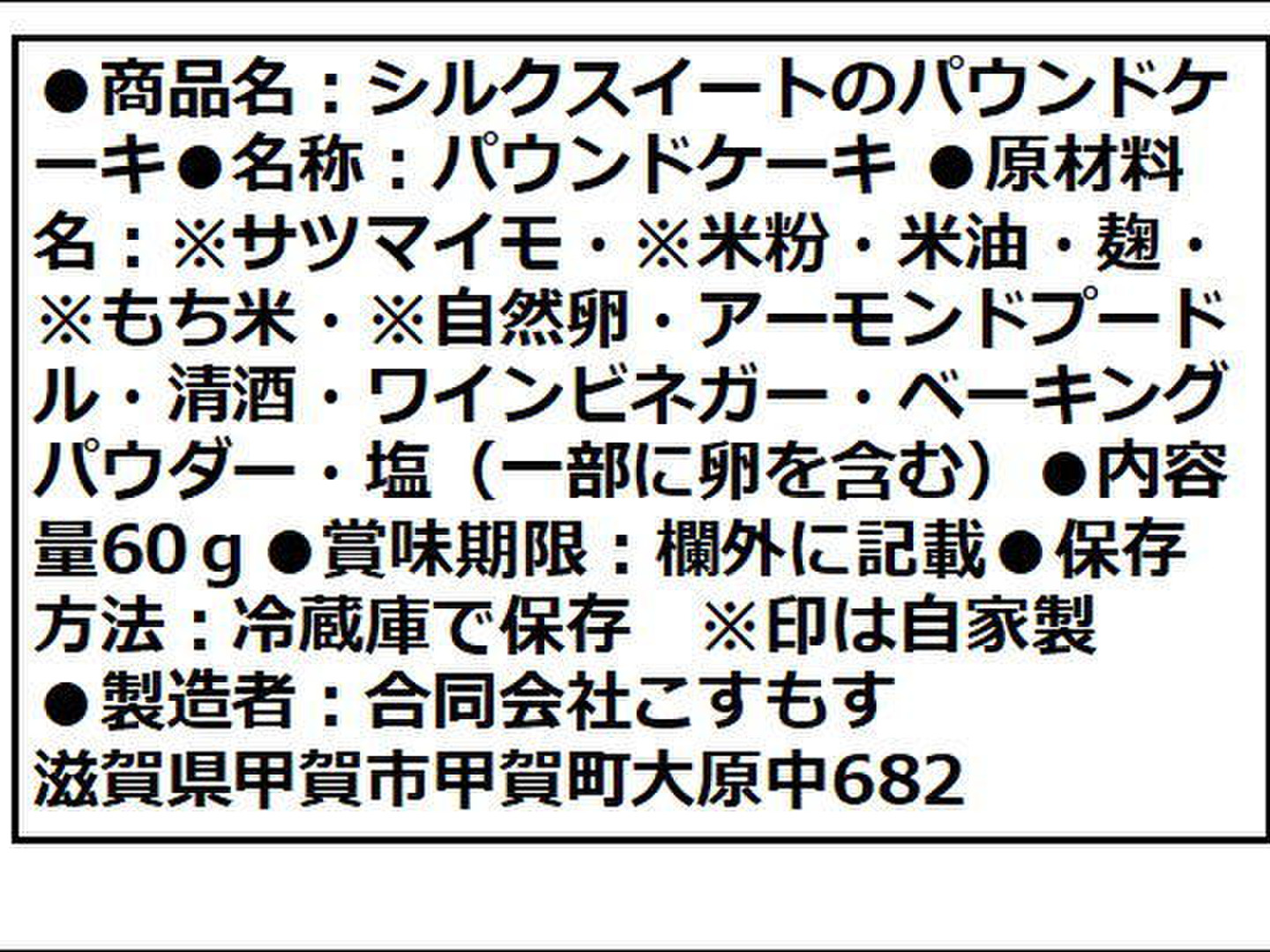 | 内容 | シルクスイートのパウンドケーキ 1個500g 2個まで同梱可能 賞味期限3週間 ※3個以上ご注文の方は専用セットをお作りします。 | ||||||