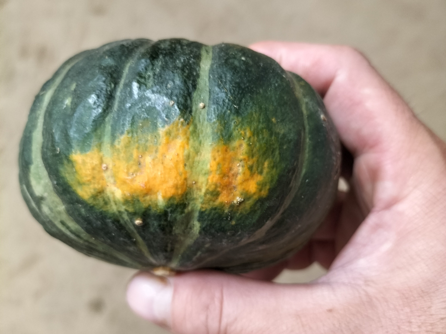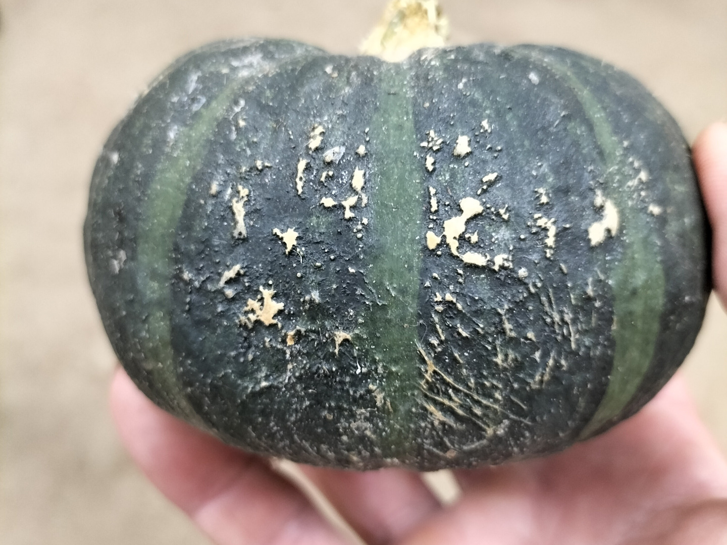 手のひらサイズのカボチャです。未熟果というわけではなく、これで一人前に熟した状態です。