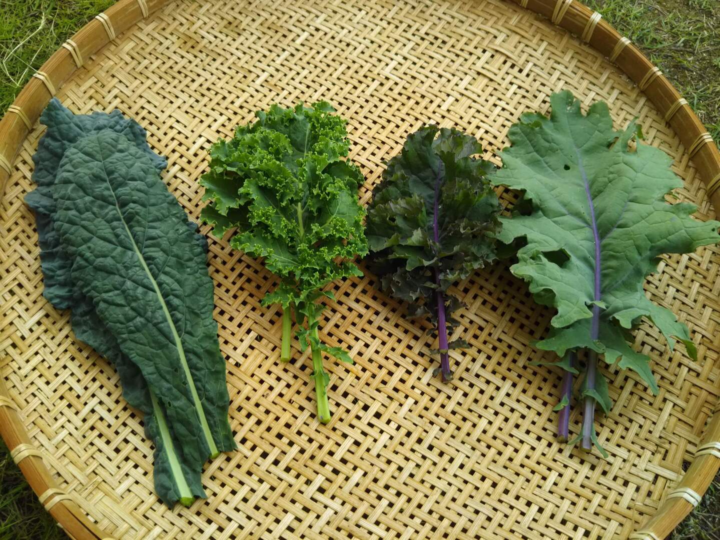農薬と肥料を使わずに、自然の力で育ったケール達を60サイズいっぱい(400g以上、各種20枚前後)でお届けします。※葉の大きさで重さが変わるため、枚数は前後します。