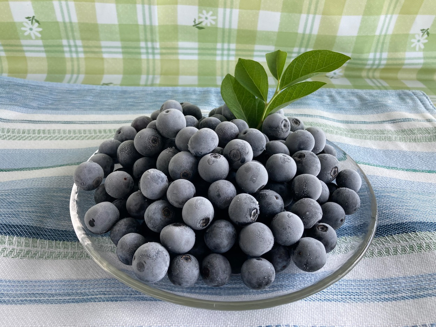 当園主は、朝食のプレーンヨーグルトに30〜40粒ほど混ぜて食べています。ヨーグルトやムース、アイスなど数粒、飾り程度にのせ食べることも多いかと思いますが、それではブルーベリーの良さが生かせません。数粒ではヨーグルトの酸っぱさに負けてしまいます。ここはドサッと30粒以上は入れましょう。すると自然な甘味が口の中でジュワーと広がり爽快なことこの上ないです。ただ、お腹の弱い方は解凍してからお召し上がりください。