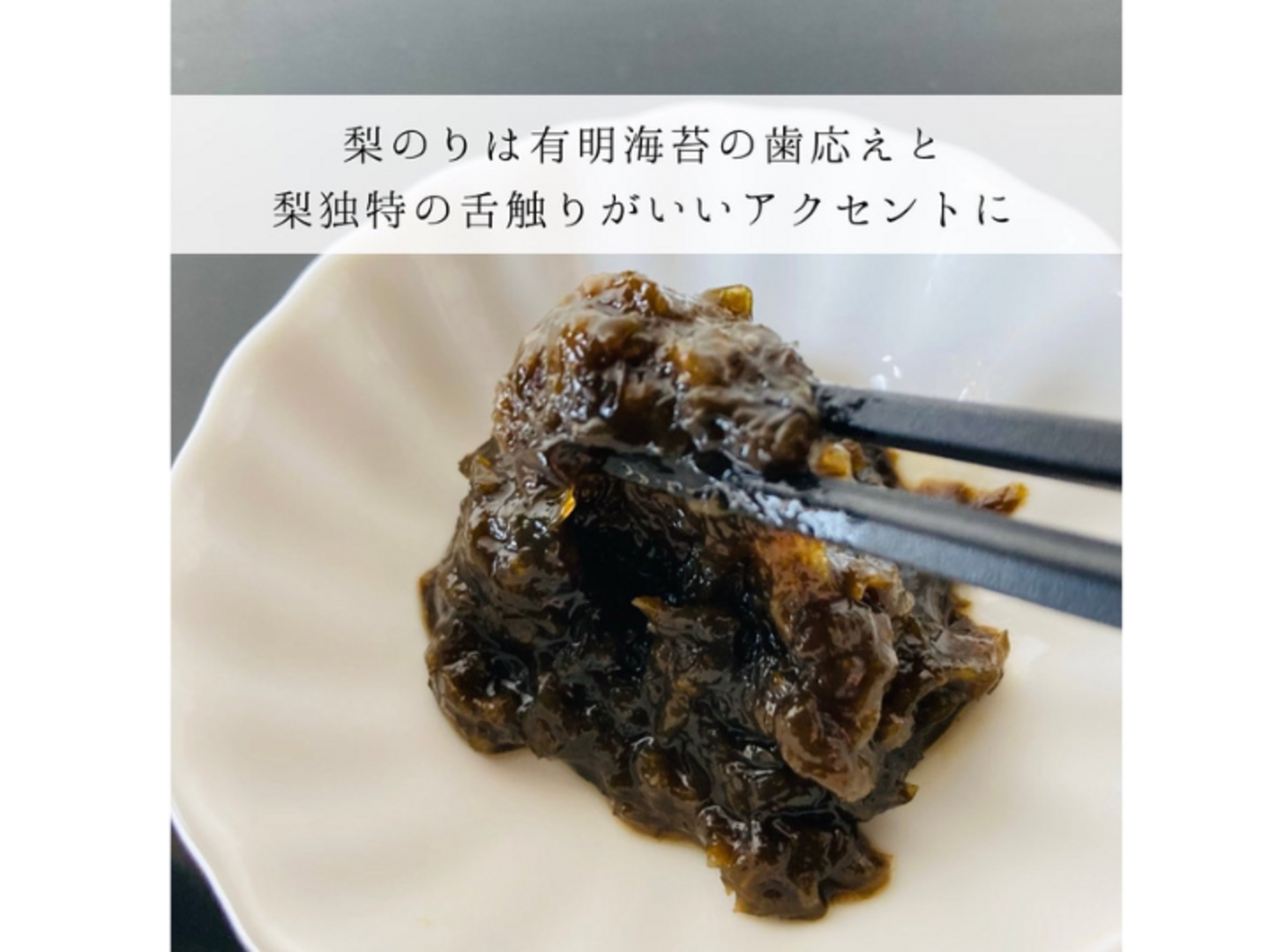 海苔は通常高価なのであまり使われない地元特産有明海の黒磯海苔を贅沢に使いました。梨独特の舌触りと優しい甘みがして安心安全で美味しい海苔の佃煮です。