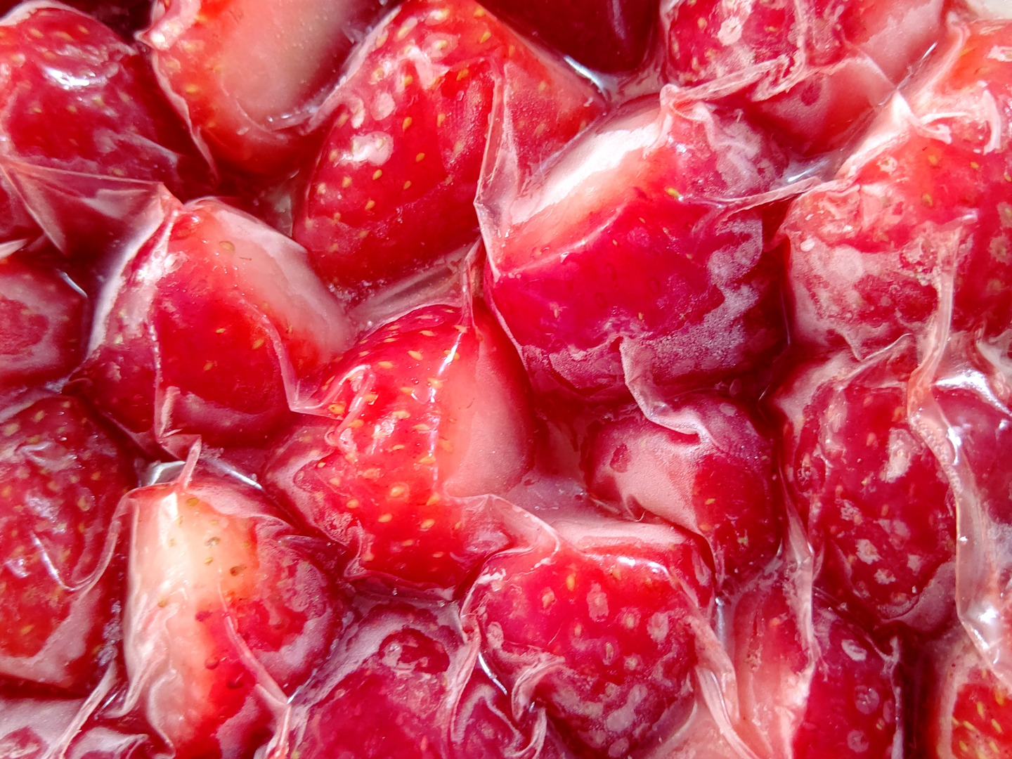 真空包装機を使ってパック詰めすると、いちごに含まれる空気まで抜くので、酸化や乾燥を防ぎます。