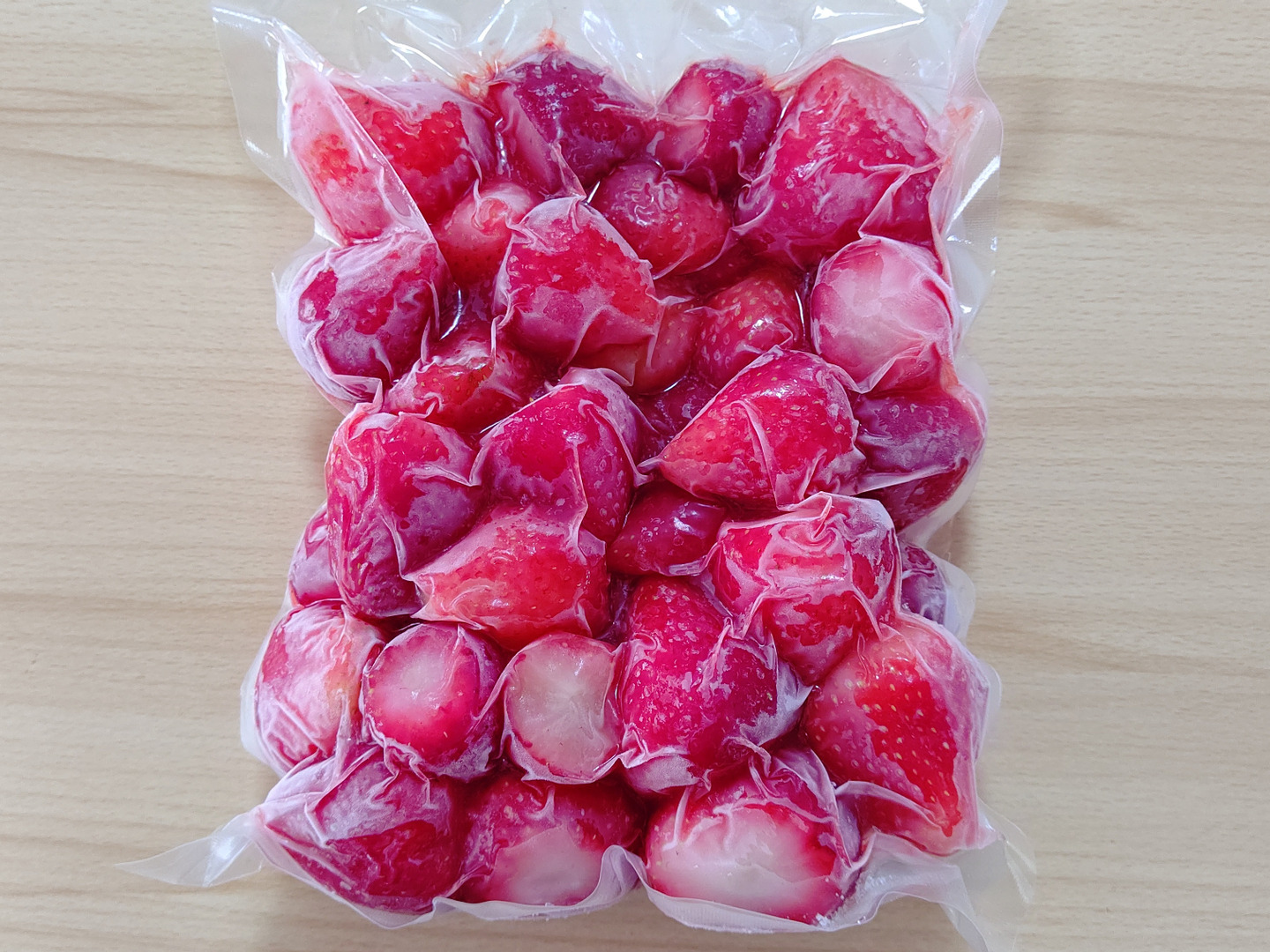 朝摘みの新鮮な完熟いちごをきれいに洗浄し、ヘタを取って真空パックに詰め、-19℃で冷凍しました。