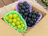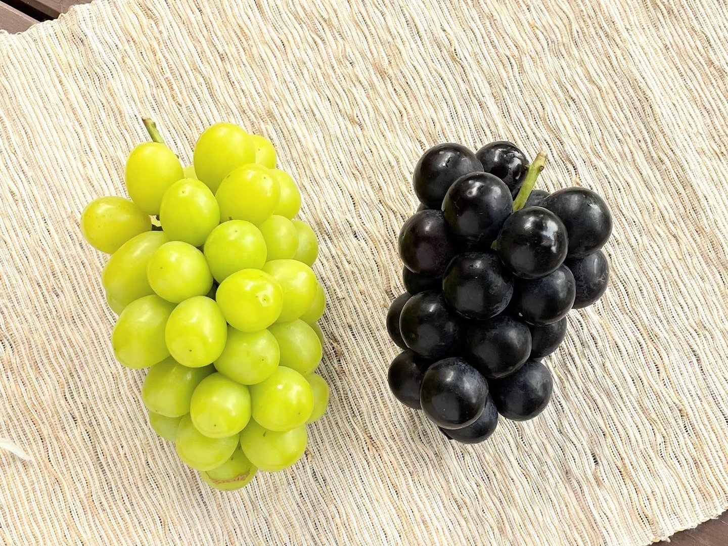 シャインマスカットは、華やかで爽やかなマスカット香と芳醇な甘さが魅力の緑色ぶどう、ナガノパープルは、甘さが爽やかでコクがある黒ぶどう、どちらも皮ごと食べられます。