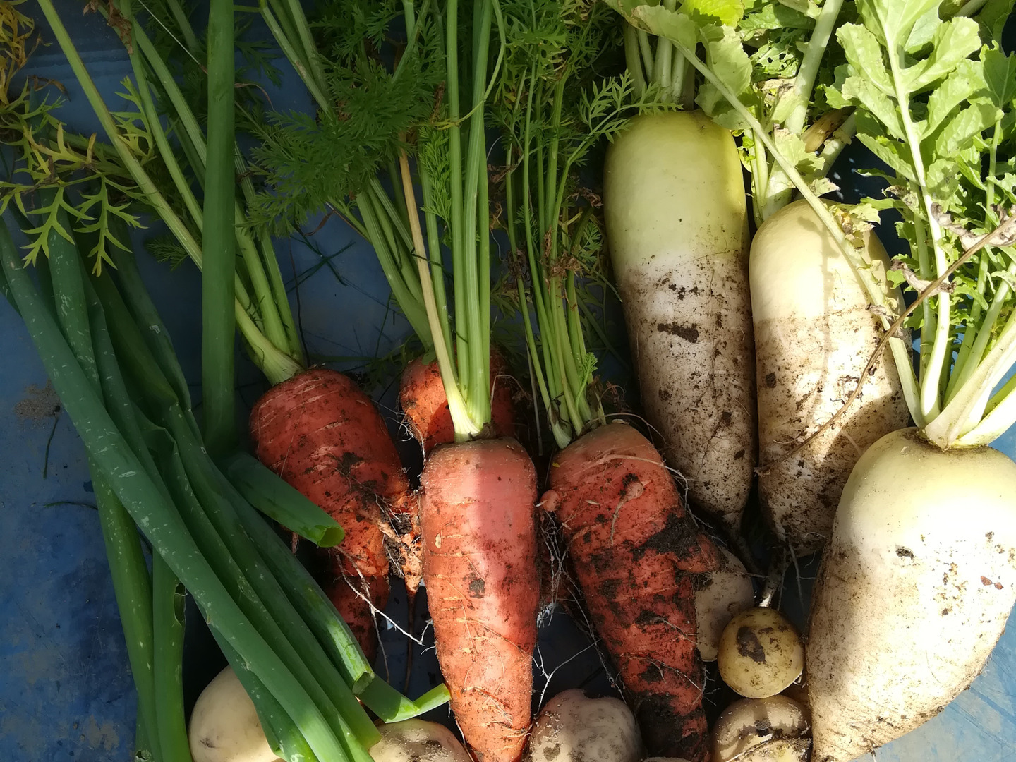 野菜セットの中身①ネギ(九条ネギ、加賀一本太ネギ)②カブ(富山かぶ、紅カブ)③早池峰菜④小松菜⑤ちりめん葉からし菜⑥ルッコラ⑦高菜⑧大根(源助大根、宮重大根)⑨春菊⑩パセリ⑪青唐辛子(あじめこしょう)⑫千筋京水菜⑬チンゲン菜⑭里芋⑮さつま芋、今後は白菜、キャベツ、ブロッコリー、タアサイ、人参などの収穫を控えています