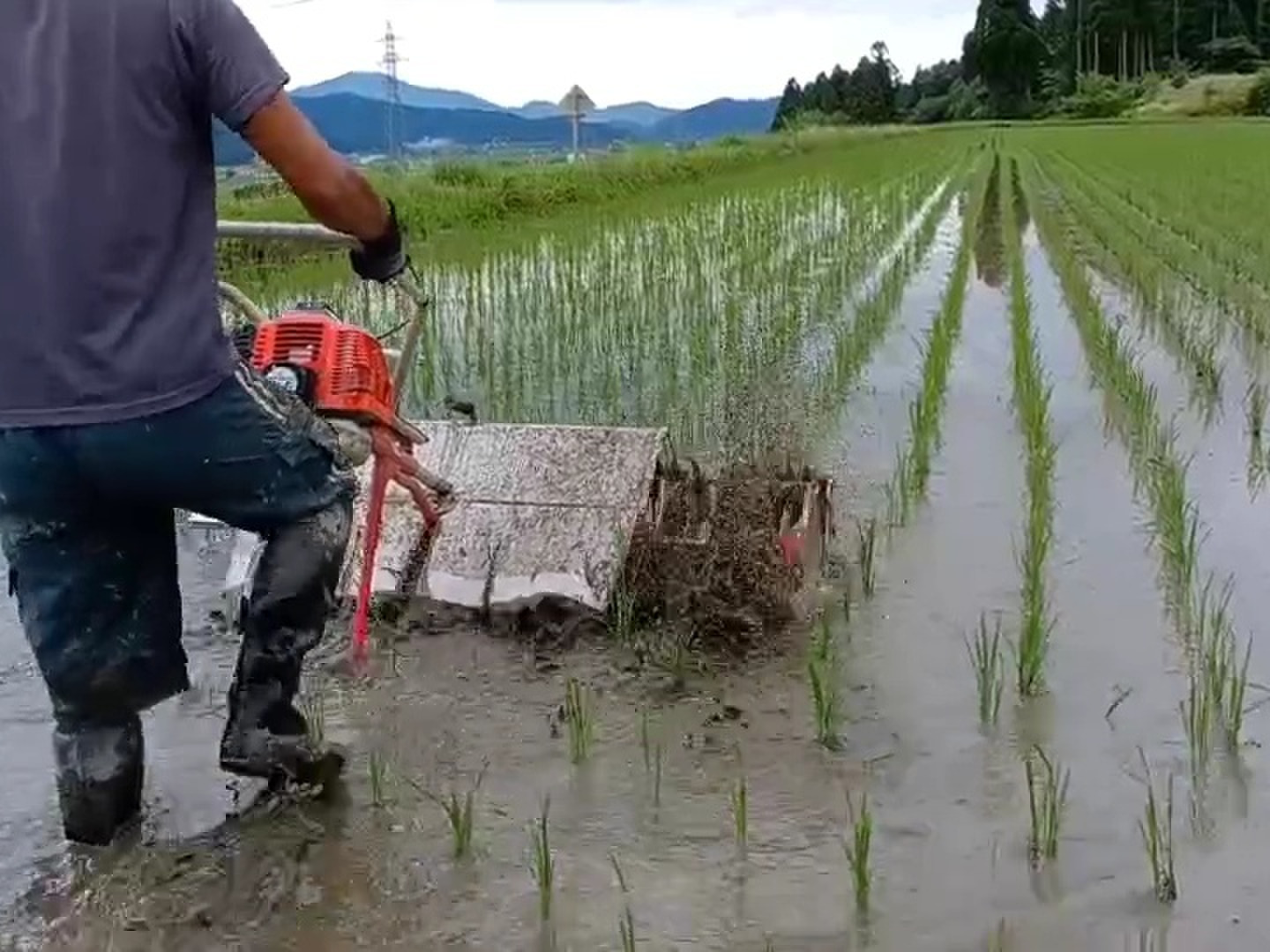 除草機を押して田んぼを歩き、手作業で除草しています。