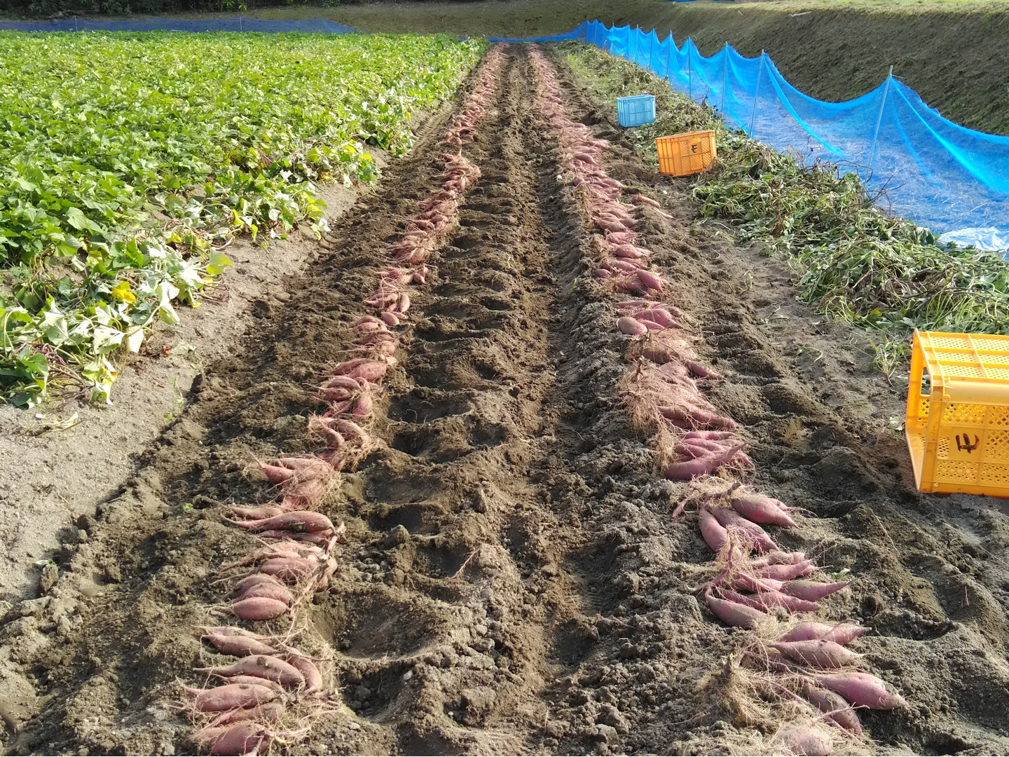 熊熊本の里山の畑で育てました。路地栽培のサツマイモ、紅はるかです。マルチをはると草取りは減りますが、やはり美味しいサツマイモを収穫したいので、露地栽培にこだわりました。