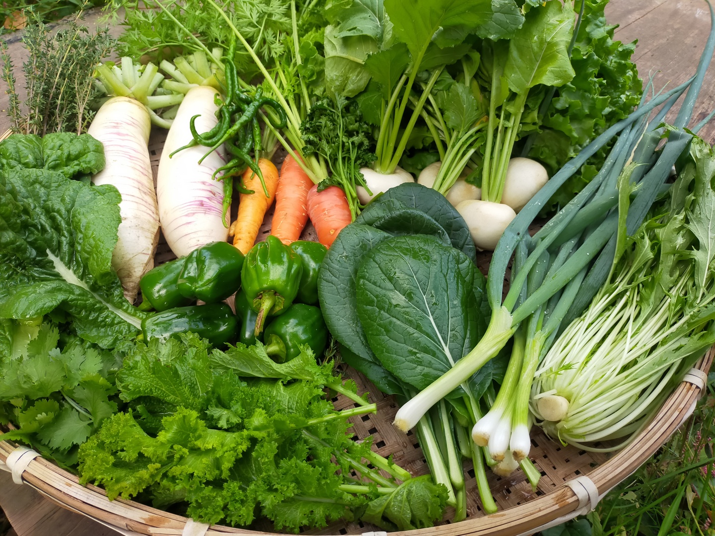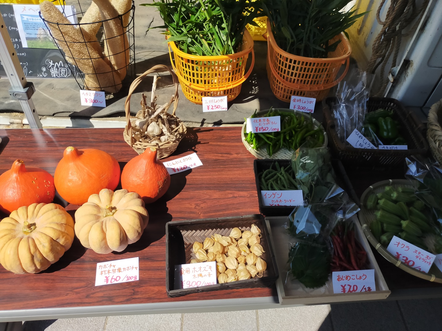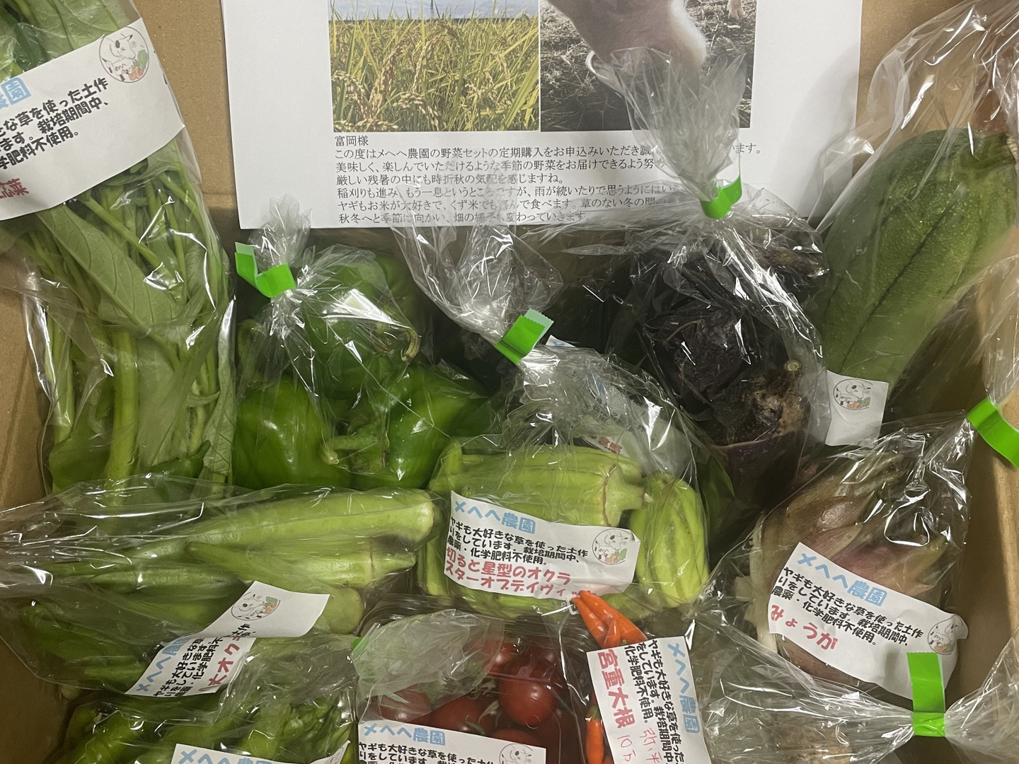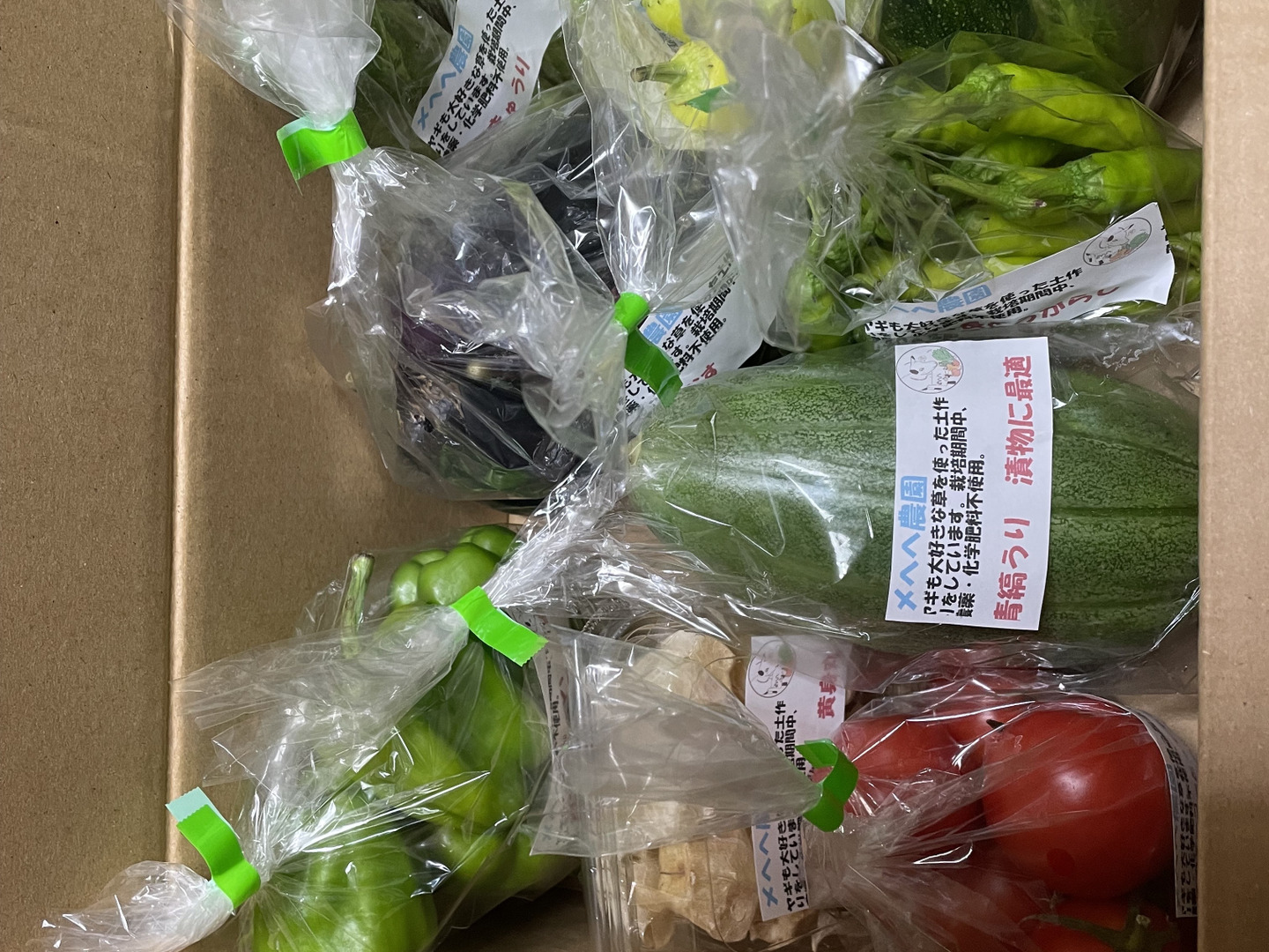 野菜セットの中身①ピーマン(ちぐさピーマン)②ナス(真黒なす、佐土原ナス、ヘタ紫なす)③食用ほおずき(黄身丸、太陽の子)④伏見甘長とうがらし⑤空芯菜⑥唐辛子(黄からコショウ、あじめこしょう、弥平唐辛子)⑦マコモダケ⑧サツマイモのツル⑨しその実⑩カボチャ(打木甘栗カボチャ、白皮砂糖カボチャ)⑪金時草、など