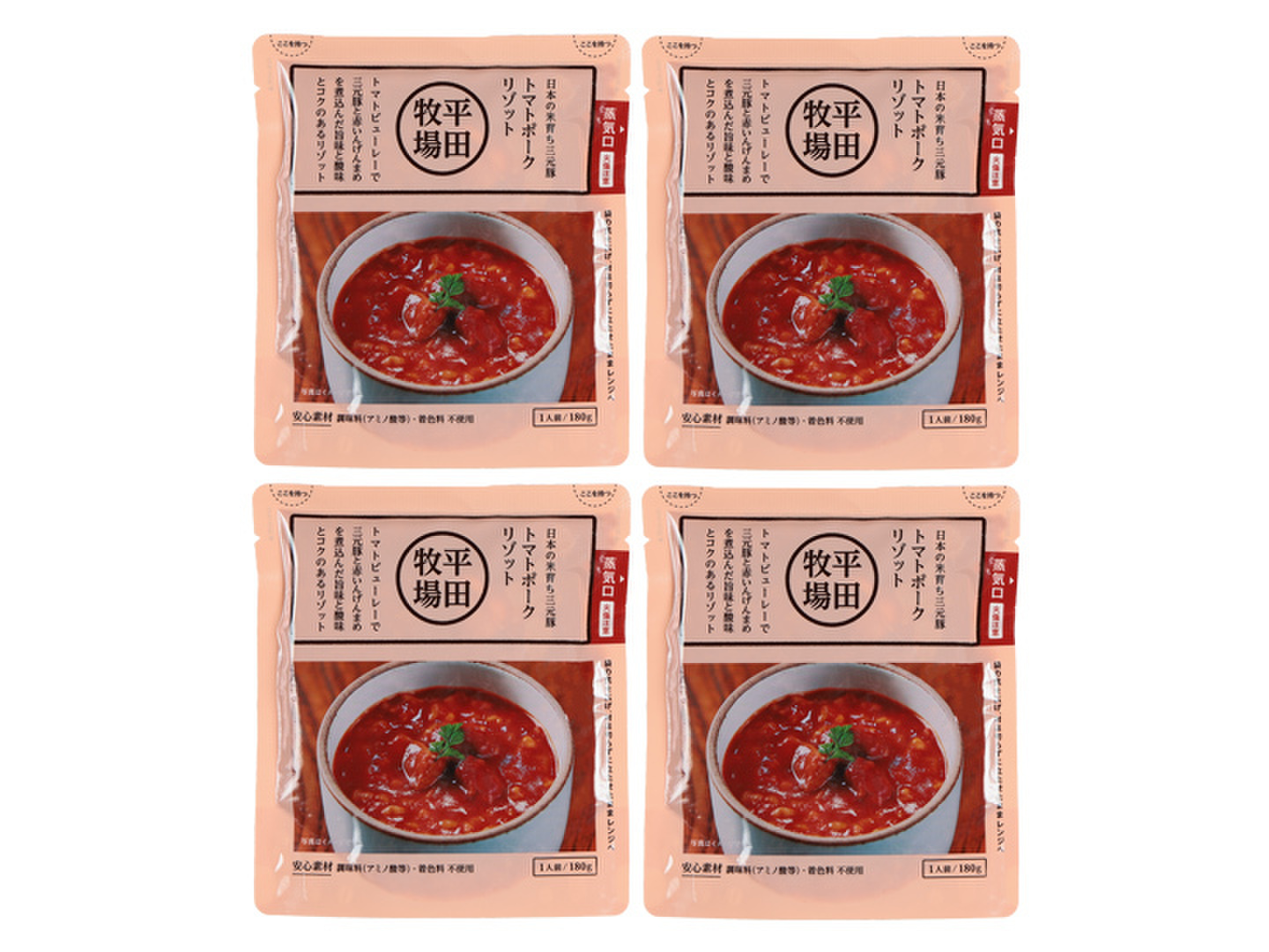 <ネコポス発送>日本の米育ち三元豚トマトポークリゾット・4食入り(NO.40)[常温発送]