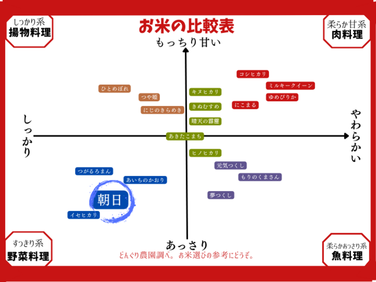 現代では、あさひはあまりその名を知られていませんが、明治から大正時代に開発されたお米です。現代のお米はもっちり、柔らかい系が主流なのですが、最近では、あさひのような伝統的な硬いお米も見直されています。普段、モチモチしたお米を食べている方には少し物足りなさがあるお米ですので、ご理解の上、お買い上げください。