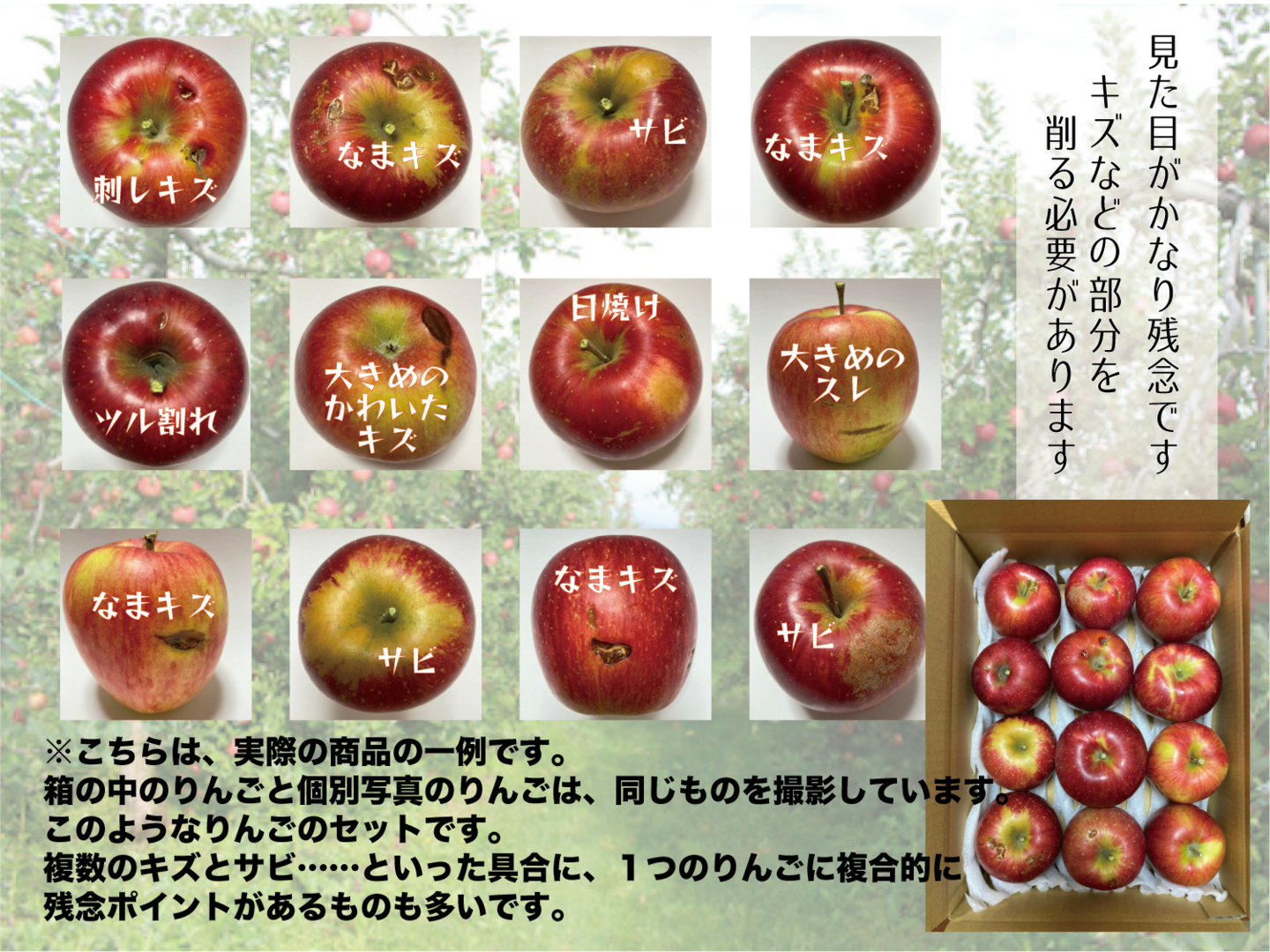 これらが複合的にあるりんごで、見た目の問題でかなり劣る/可食部が減る可能性のあるものをセットにしております。