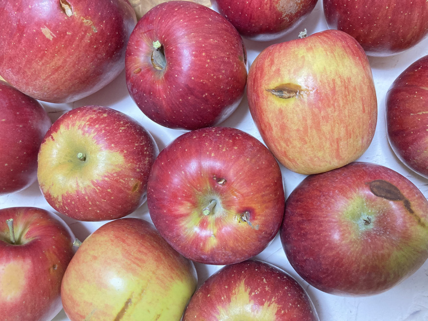 そして早めの消費をお願いいたします。りんごをよく見る、優しく触ってみるなどして、傷や日焼けの程度のひどいものからご活用ください。