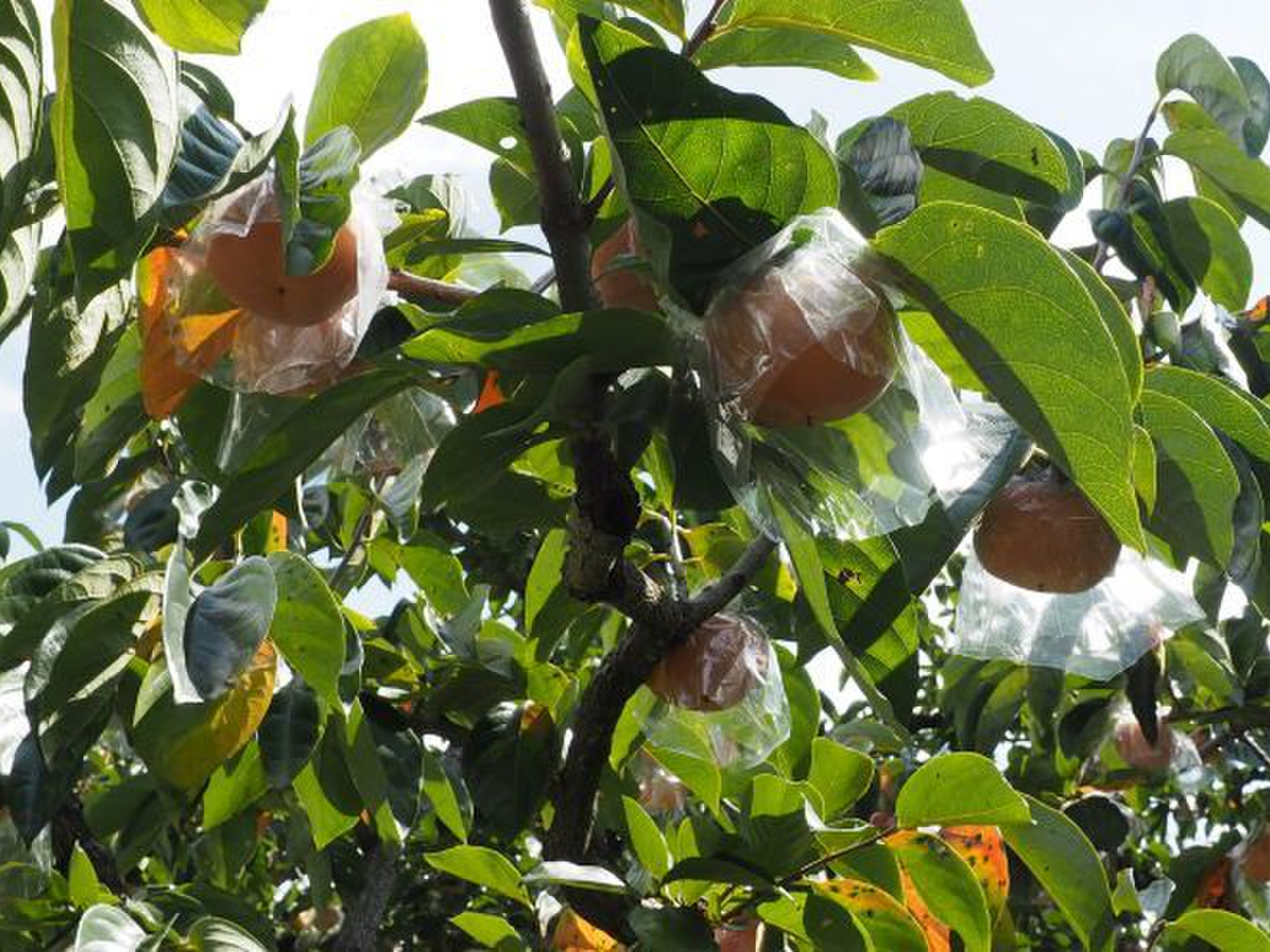 刀根早生や平核無柿を木の上に成っている状態から柿一つ一つに固形アルコールが入った袋を掛けていくことで脱渋していきます。