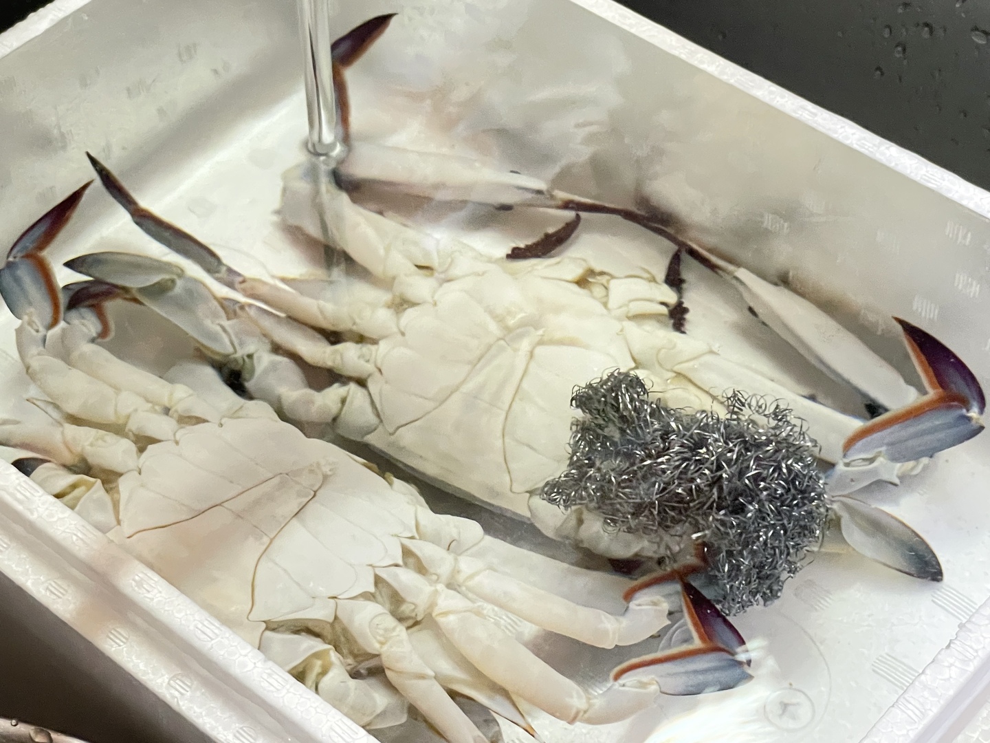 余熱をとってタレを冷やしている時にワタリガニも流水解凍してください。