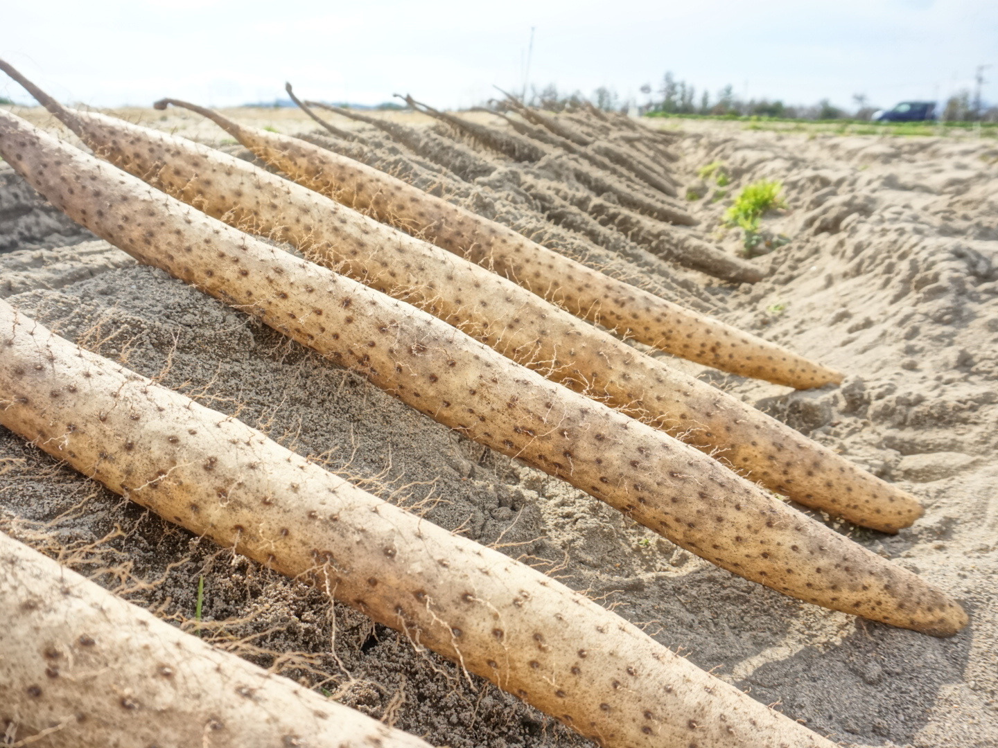 また、この砂地は長いもにとってストレスなく育つことができる土壌であるため、肌がきれいで、まっすぐ、長い芋を栽培することができます。