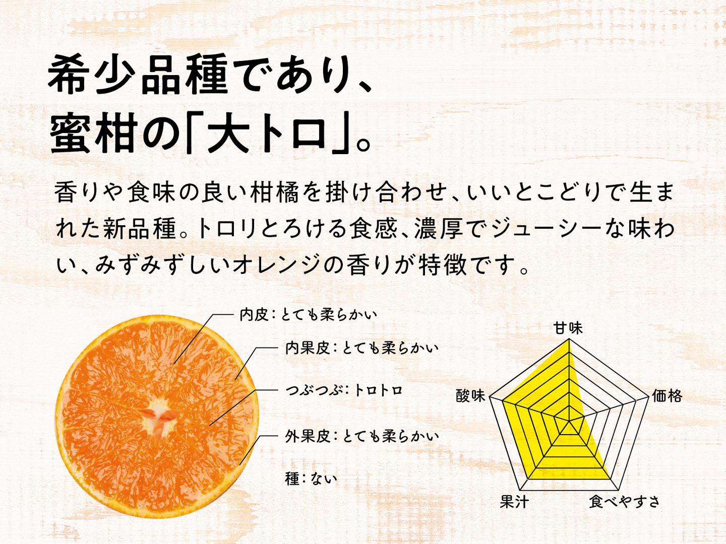 - 濃厚でジューシーな味わい、みずみずしいオレンジの香りが特徴です。