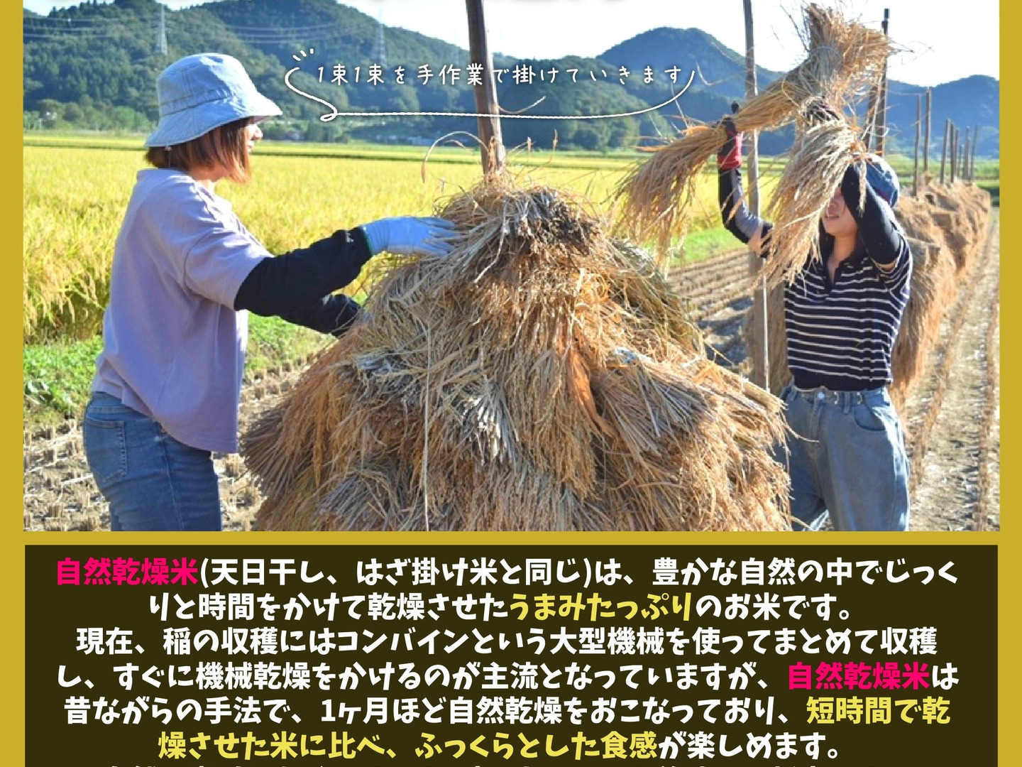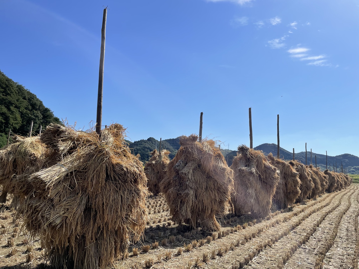 「自然乾燥米」は、稲の束を一つ一つ丁寧に棒にかけて重ねていき、乾燥状況を見て束をかけ直す作業を行い、ムラなく1ヶ月間乾燥させたものです。
