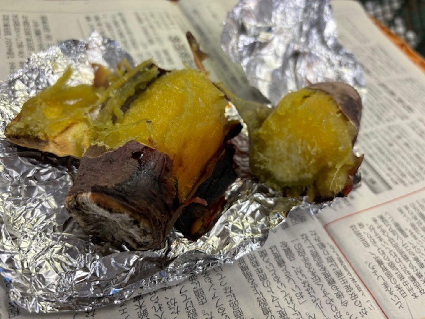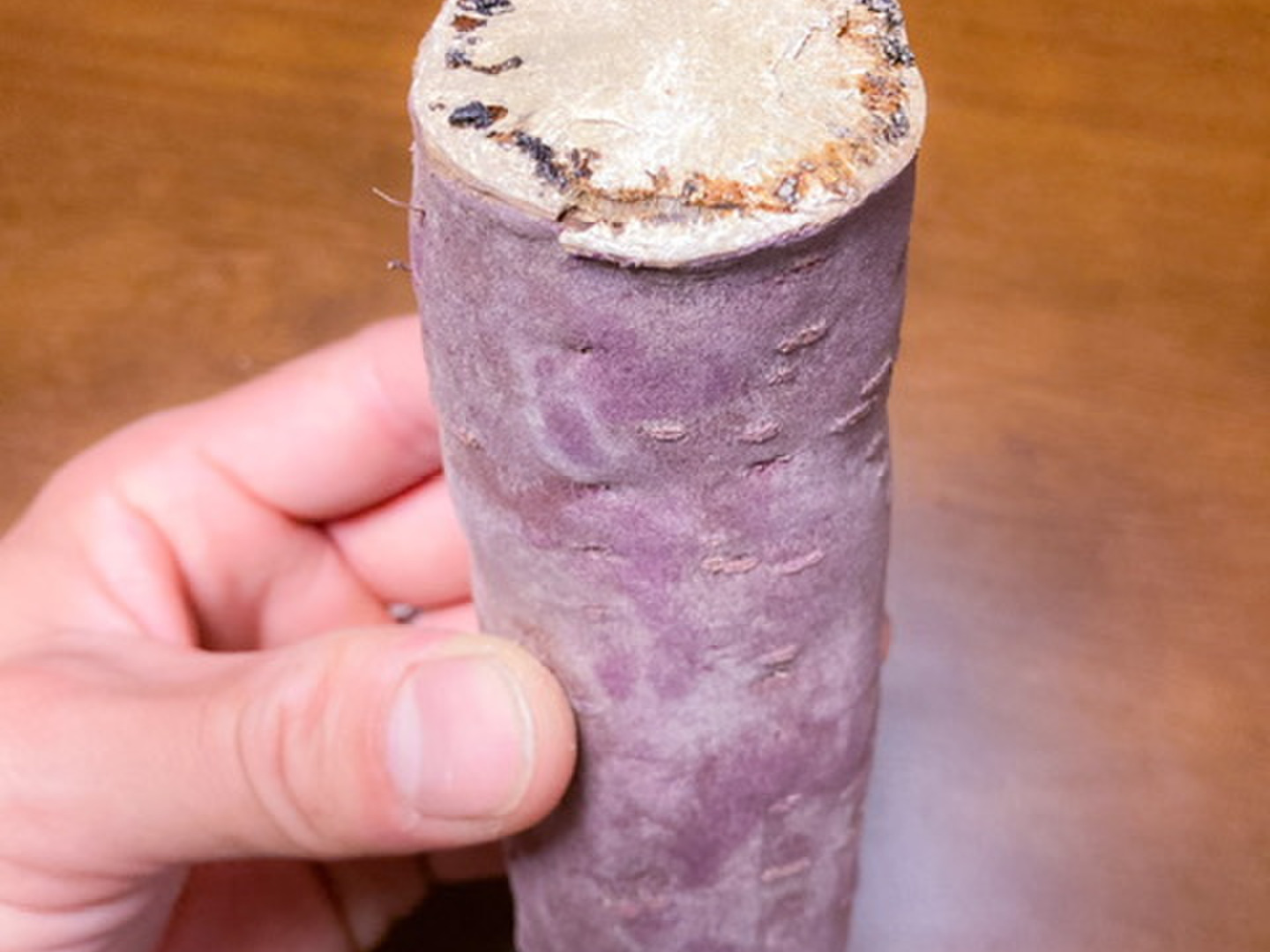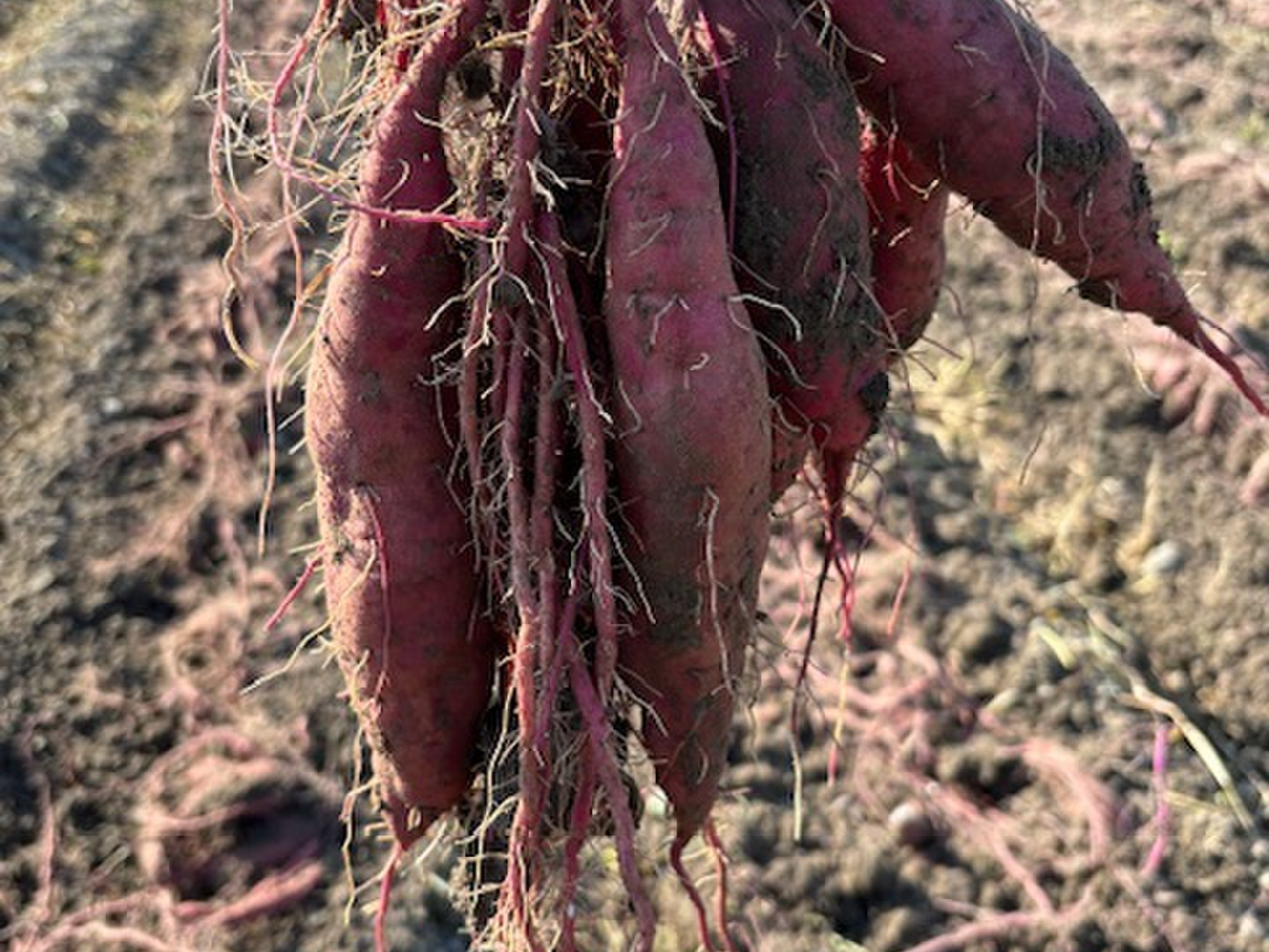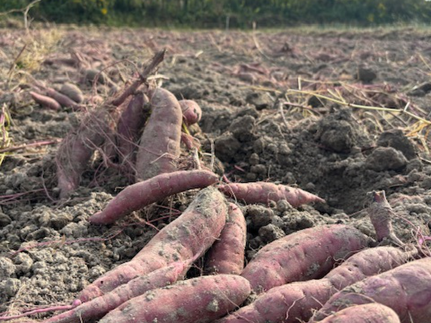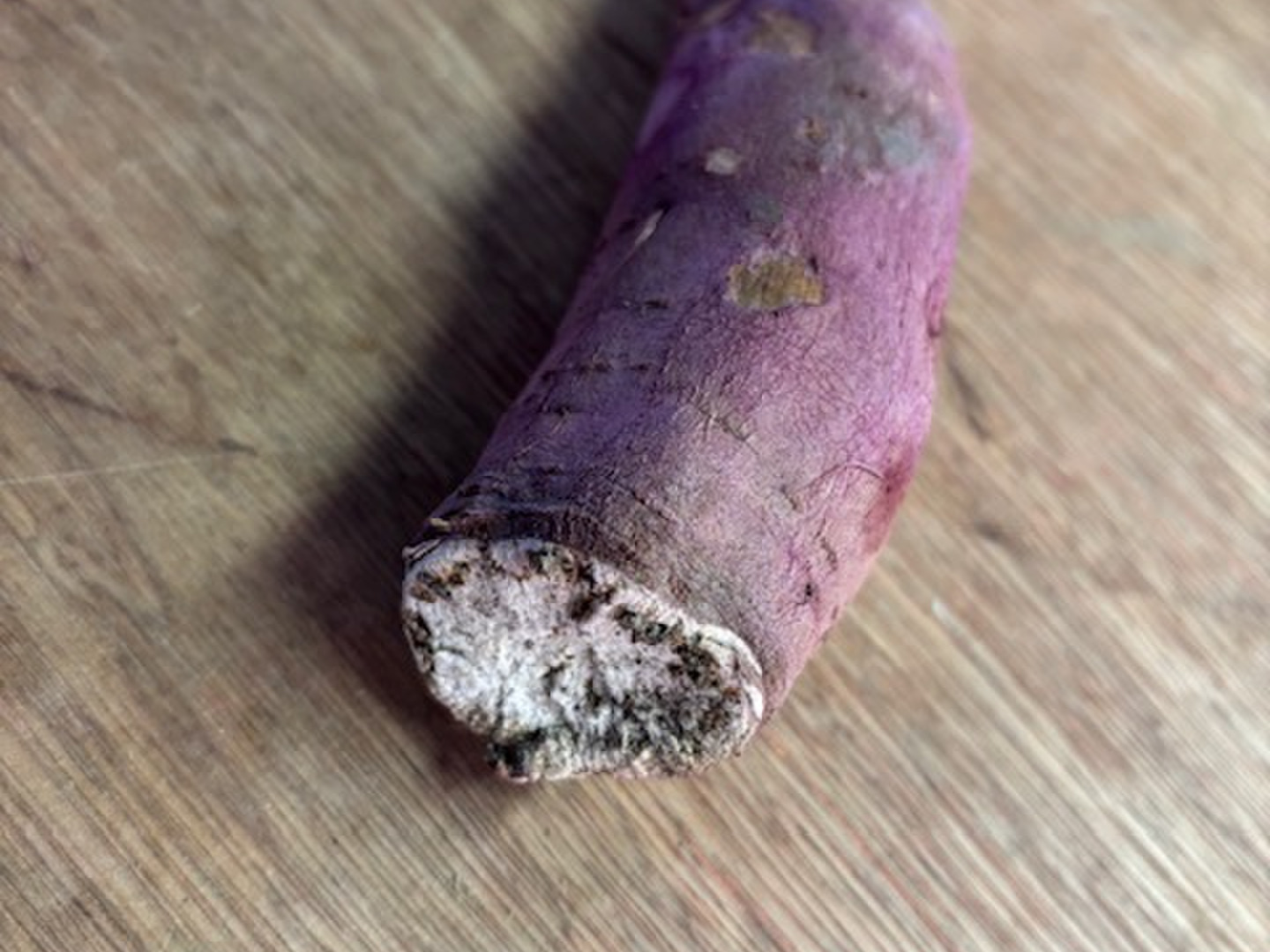 収穫の際に、深い場所に成っていて、収穫機で切ってしまった芋です。