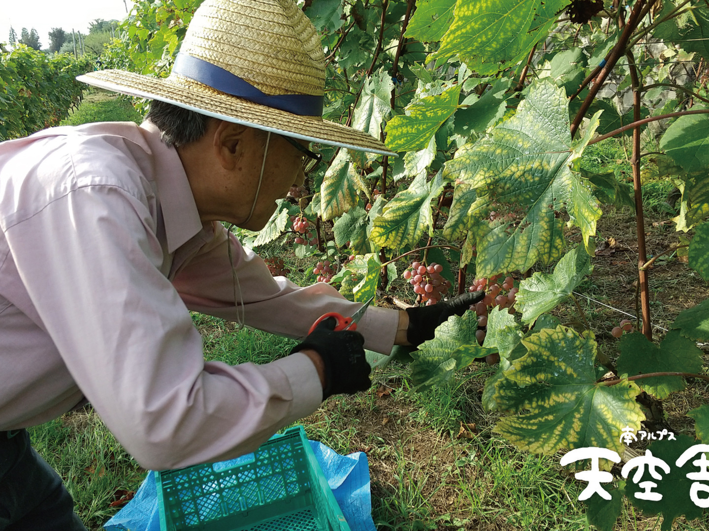 南アルプス上宮地の一枚畑で栽培する甲州ぶどう。甲府盆地を一望する標高約400mの高台に南北に垣根を伸ばして栽培しています。北から吹く「八ヶ岳おろし」が湿気を飛ばし、早南アルプスの山々が早々に西日を遮り、昼夜の十分な温度差を確保しました。扇状地であることから水はけは抜群です。